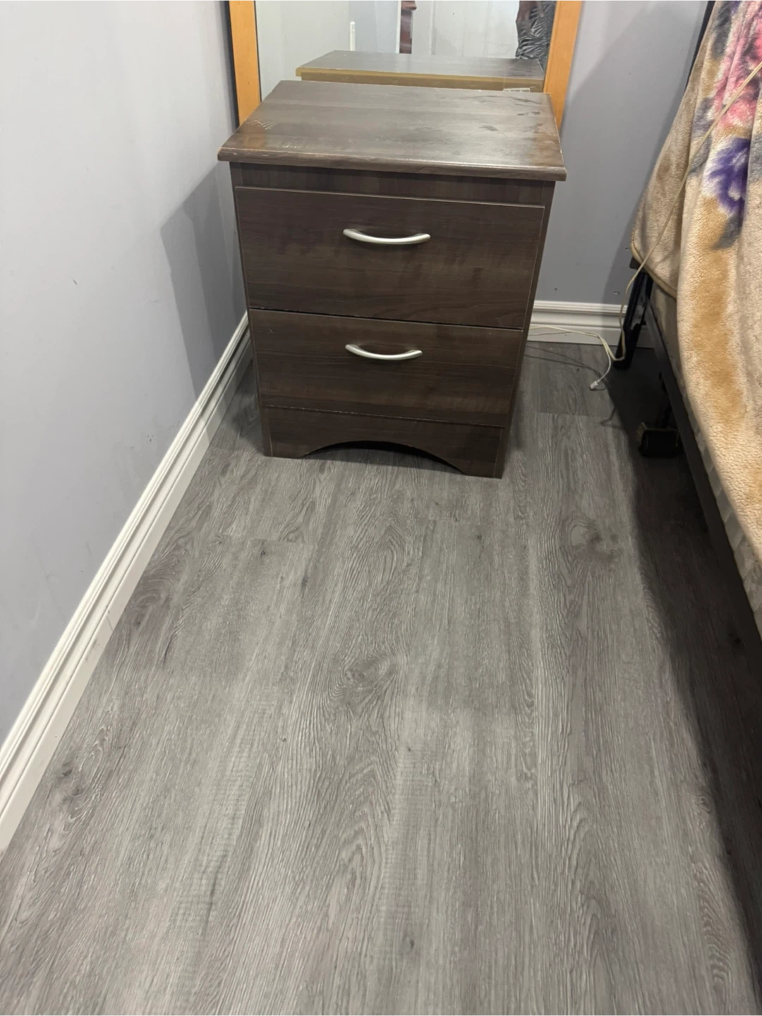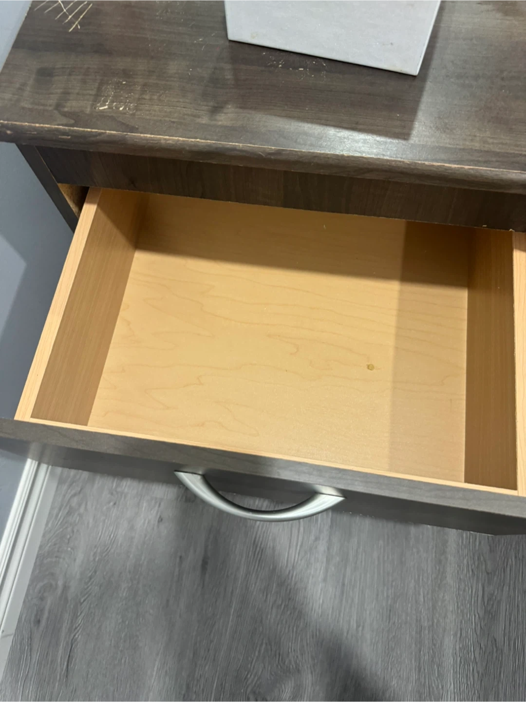 Selling a brown wood nightstand with two drawers. It's in good condition and perfect for a bedside table or small storage unit. The drawers slide smoothly and offer ample space for your essentials. It’s a great addition to any bedroom!