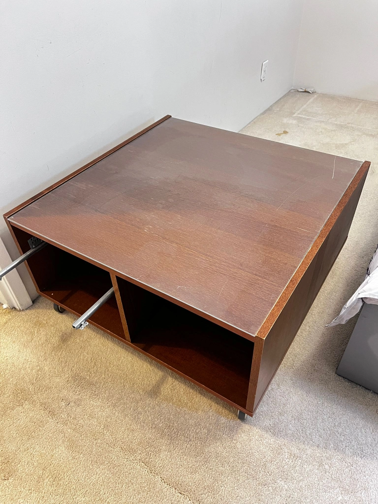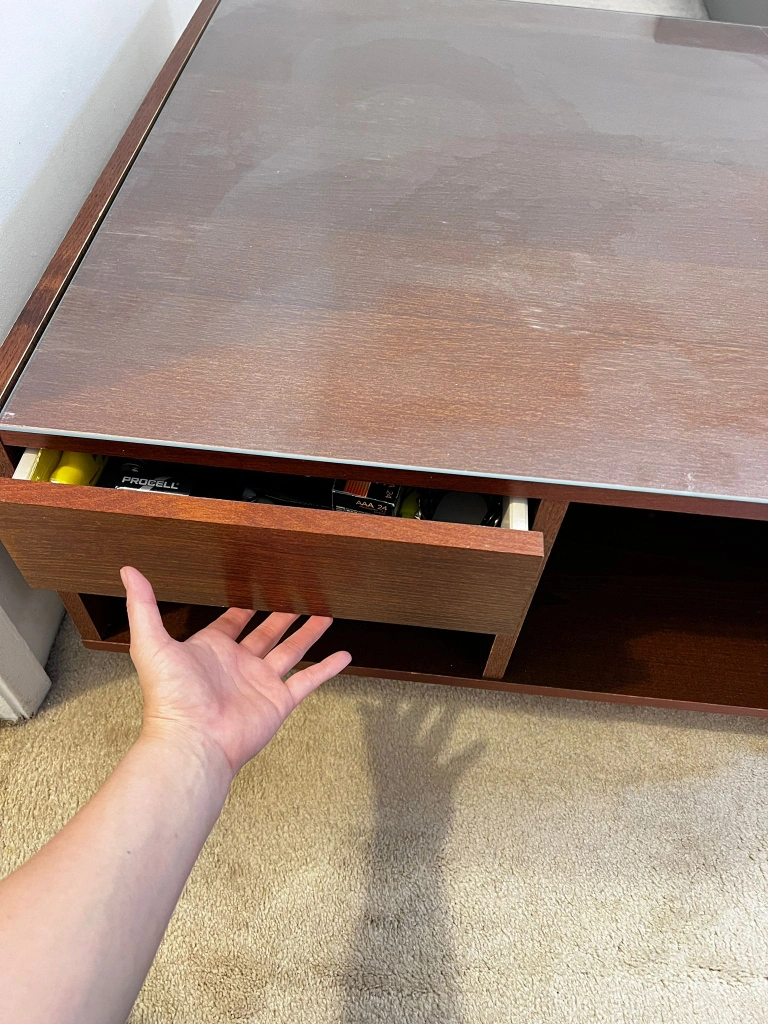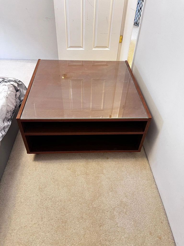 60A stylish coffee table featuring a brown wood frame and a glass top. It has a square shape and includes drawers for storage. Perfect for any living room!