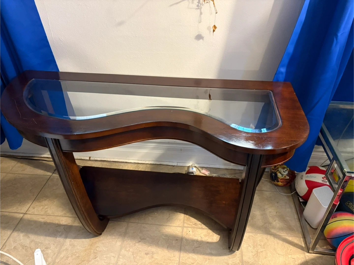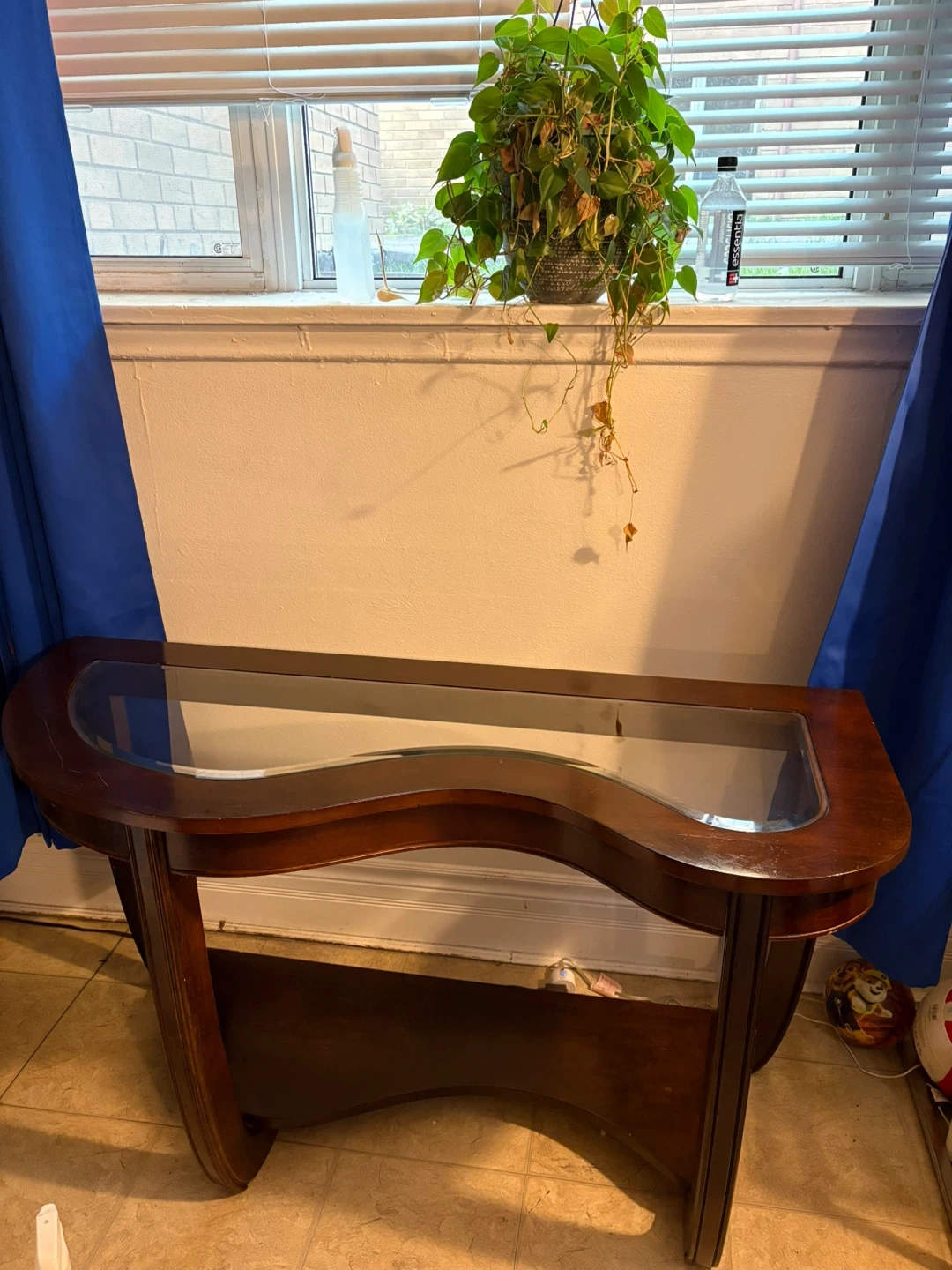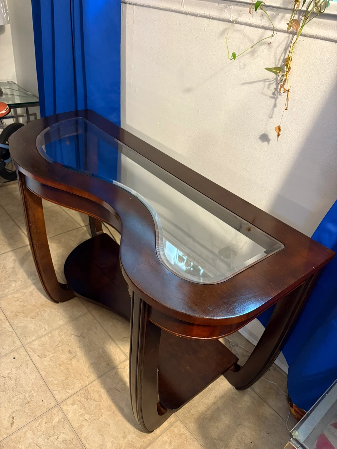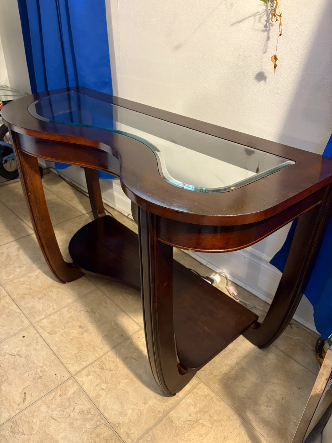 23Selling a lovely console table with a dark brown wood finish and a glass top. It's in great shape and would be a beautiful addition to any entryway or living room. 51" length 20" Depth 29" height $70 OBO