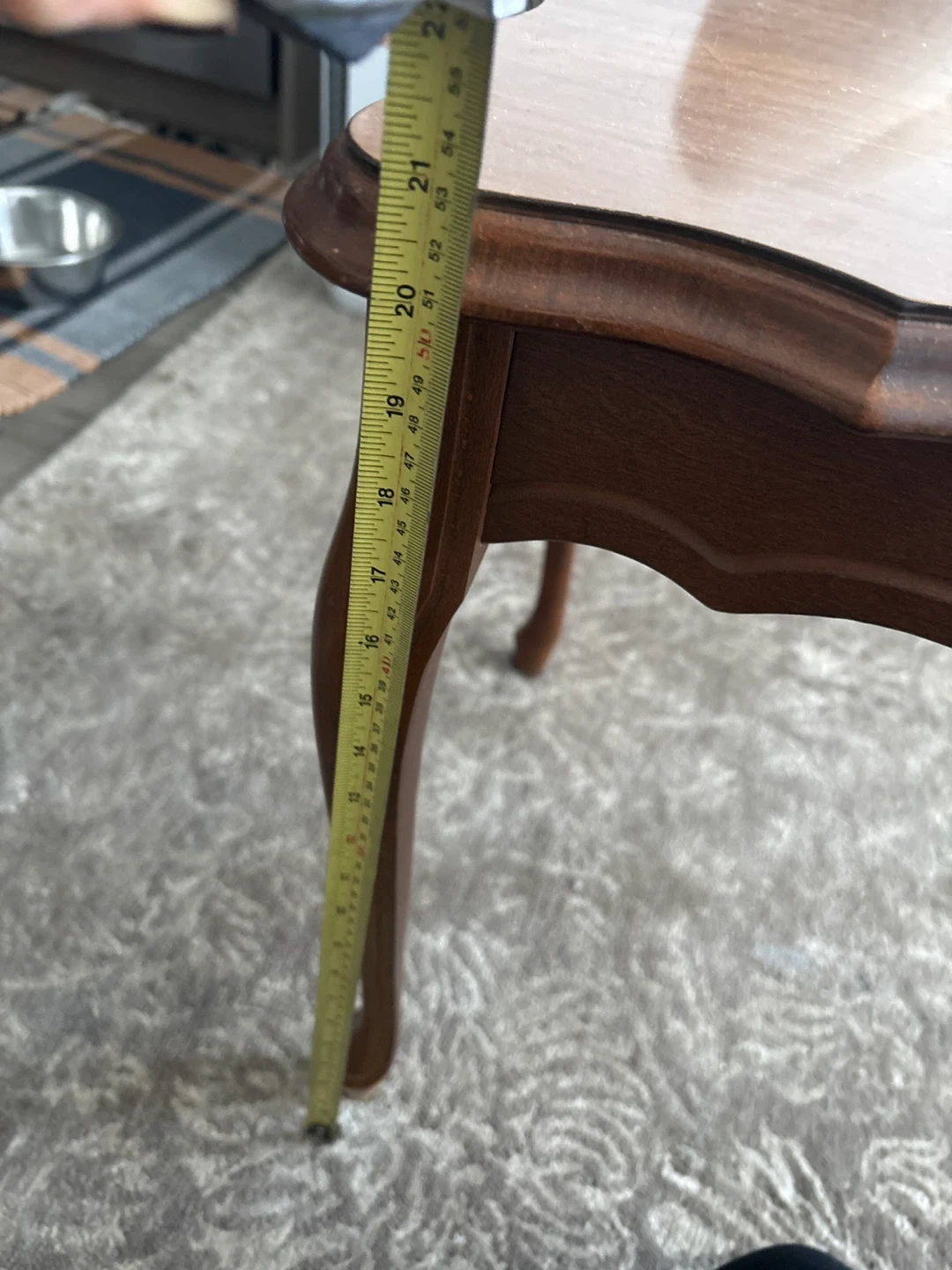 121A charming brown wooden side/coffee table ready for a new home! It measures approximately 26 inches in length, 18 inches in width, and stands about 20 inches tall. There's a small chip on one of the legs, as shown in the photos.