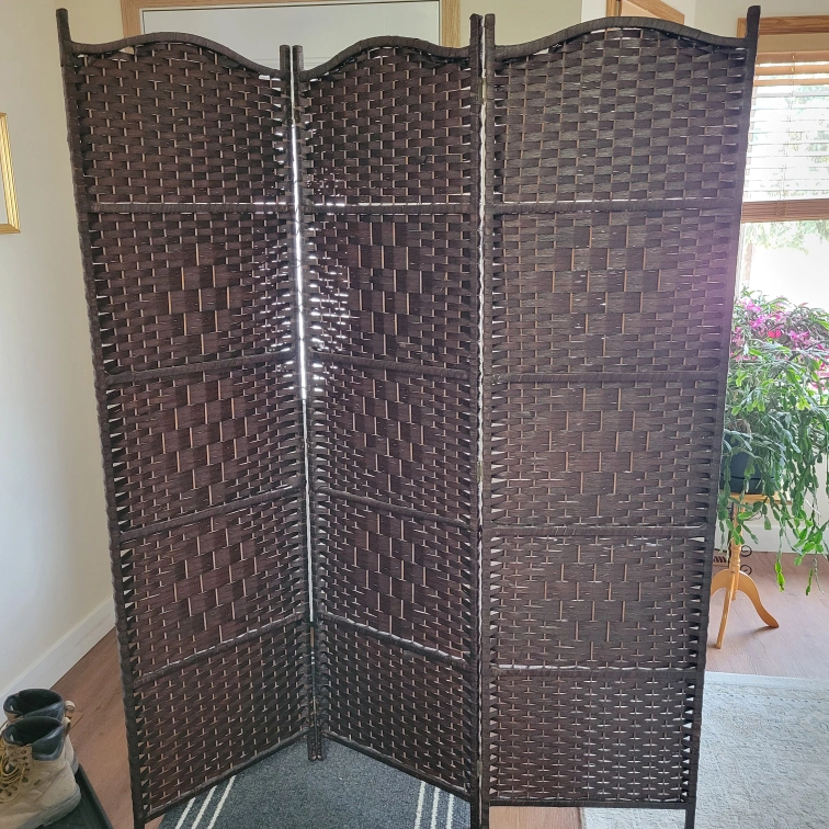 71This is a lovely brown woven room divider with three panels! It's perfect for creating a private space or adding a decorative touch to any room in your home
