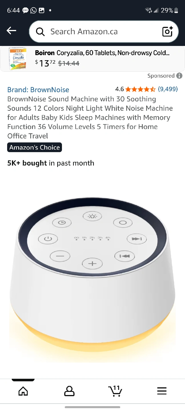 Selling a BrownNoise sound machine with 30 soothing sounds and 12 colours for the night light. It's a white noise machine suitable for adults, babies, and kids. It has a memory function, 36 volume levels, and 5 timers, perfect for home, office, or travel