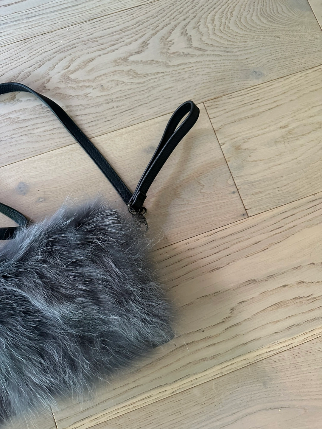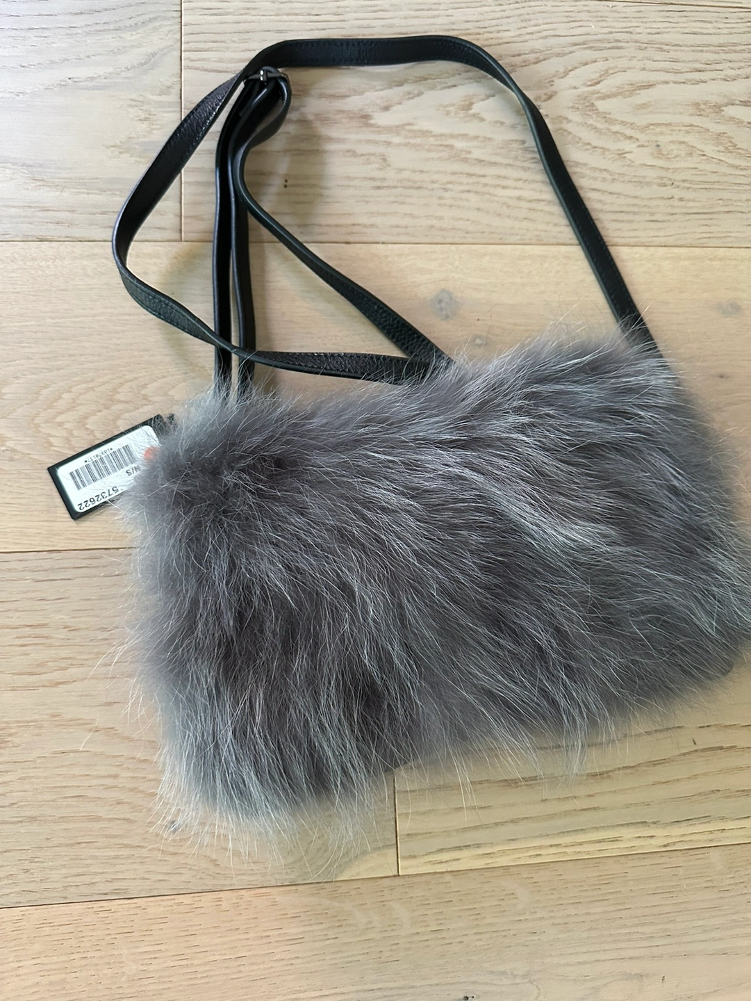 20Small grey fur clutch with a black leather strap. The clutch has a zipper closure. The strap is adjustable and can be worn on the shoulder or across the body.brand new