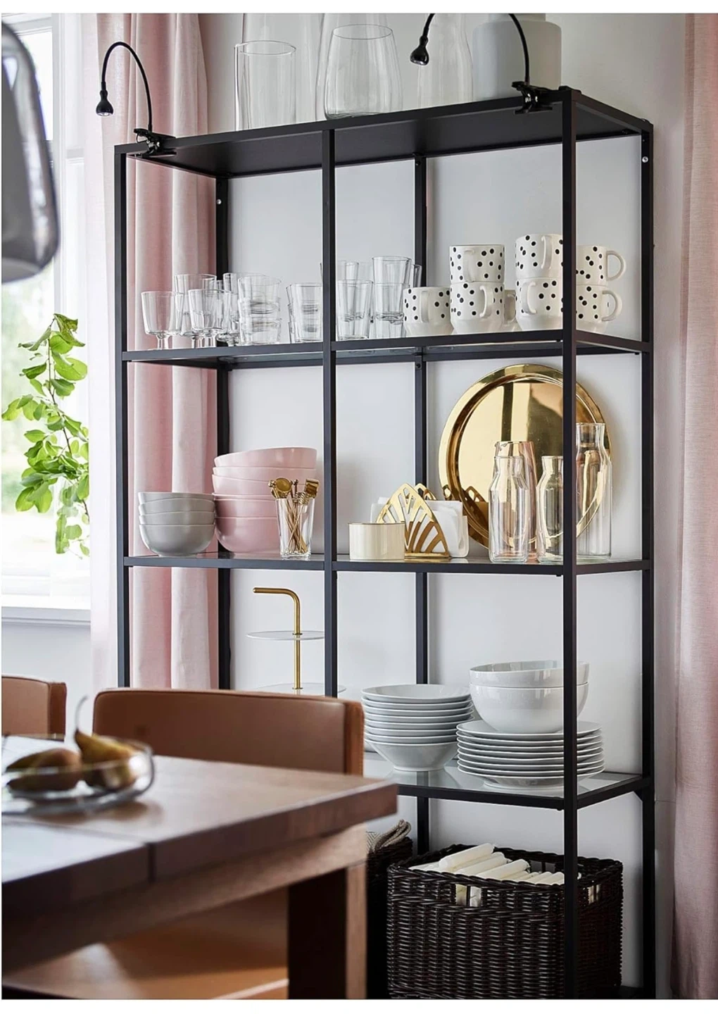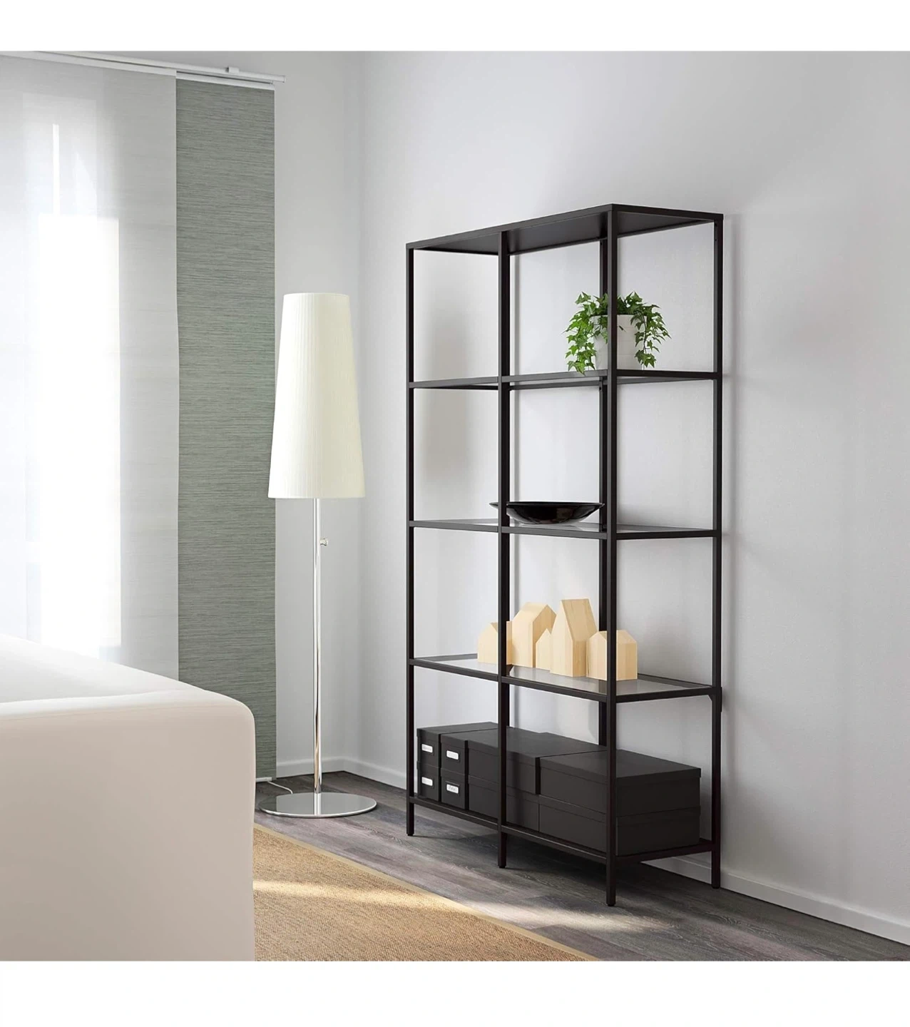 This is the IKEA KALLAX shelf unit. It's black and measures 100 cm wide and 175 cm tall. The shelf depth is 39 cm.