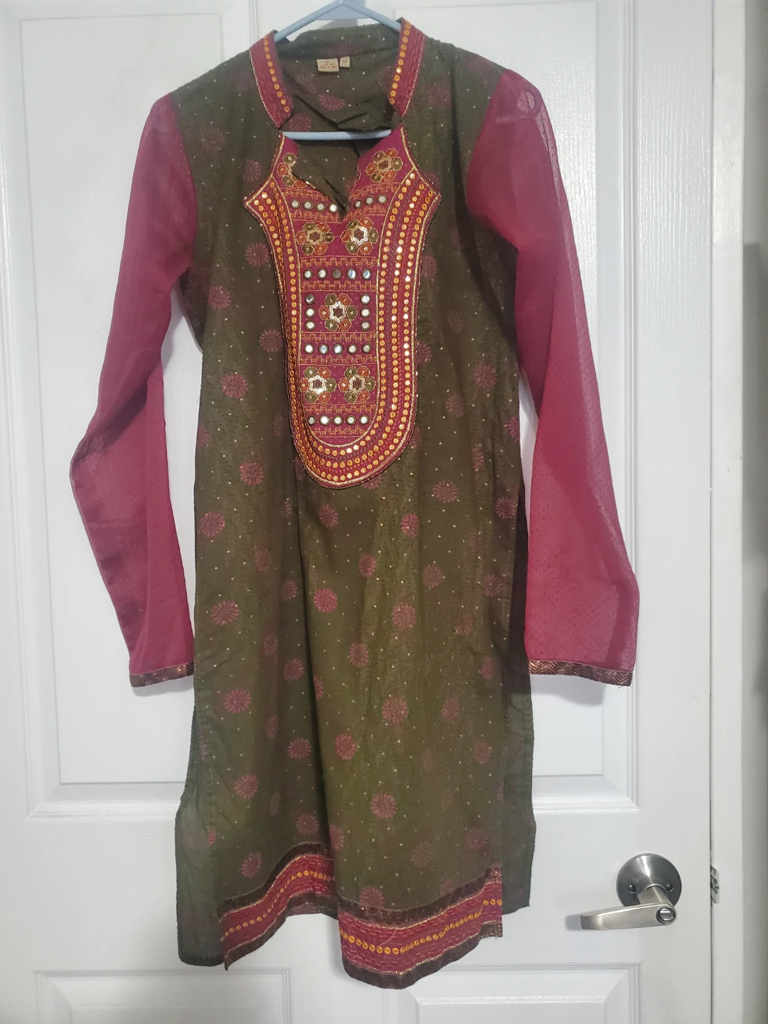 Selling a beautiful Indian salwar kameez suit in olive green and maroon. The suit features intricate embroidery and mirror work. Comes with matching pants and dupatta. Perfect for a special occasion!
