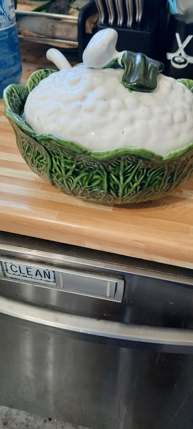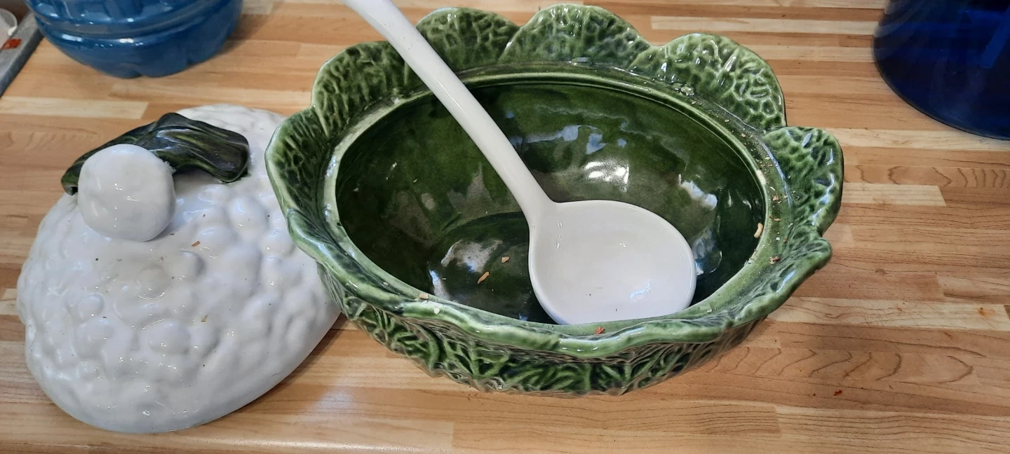 Buy & SellGreen Cabbage Tureen with LadleGreen Cabbage Tureen with Ladle$40Ceramic tureen shaped like a cabbage, with a white ladle. Made in Portugal. Great for serving soups or stews!WHERE TO MEETCheck LocationView MapSELLERmeganEastdale371 review0 chats·0 favorites·7 viewsSEND CHAT TO SELLERHi megan! I’m interested in your listing.Hi megan! I’m interested in your listing.Get the Karrot app to chatSign In to chat