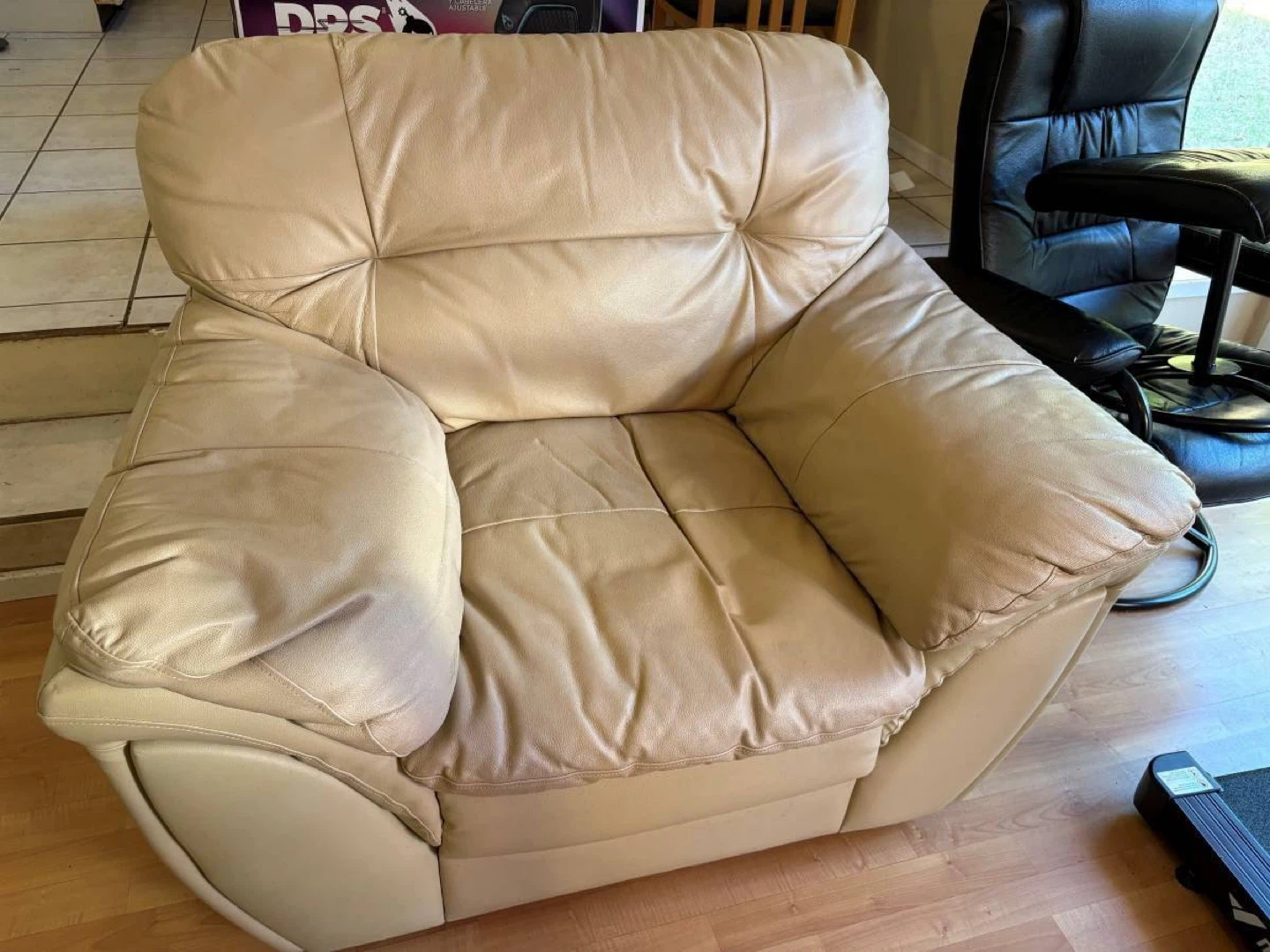 Overall great condition faux leather armchair. It looks lightly used. Comfortable. Can't delivers so must have means to pick it up.