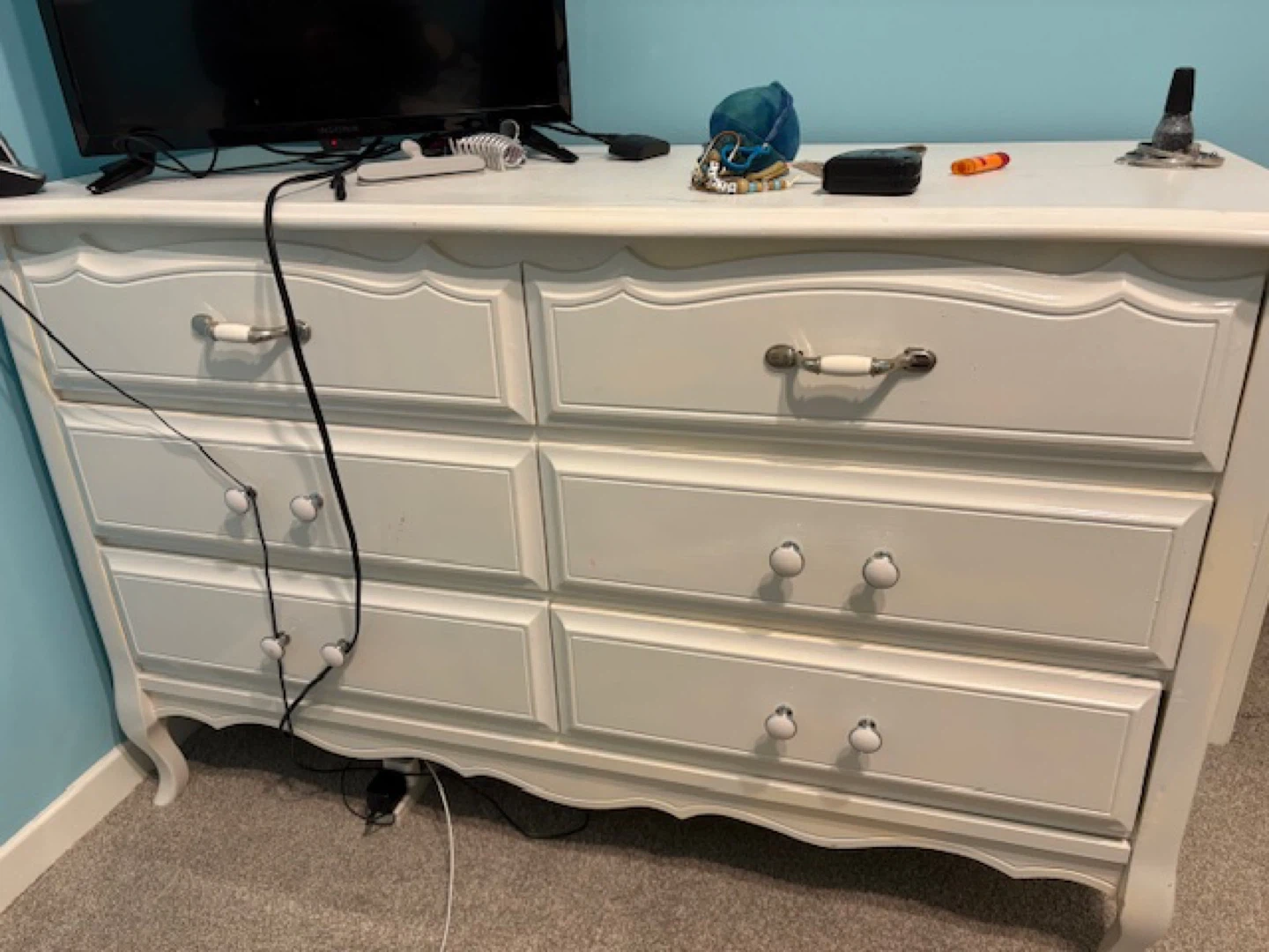 Selling a lovely white dresser with six drawers. It's in good condition and would be a great addition to any bedroom or living space. Top suggesting a paint touch up. Cash only. No delivery.