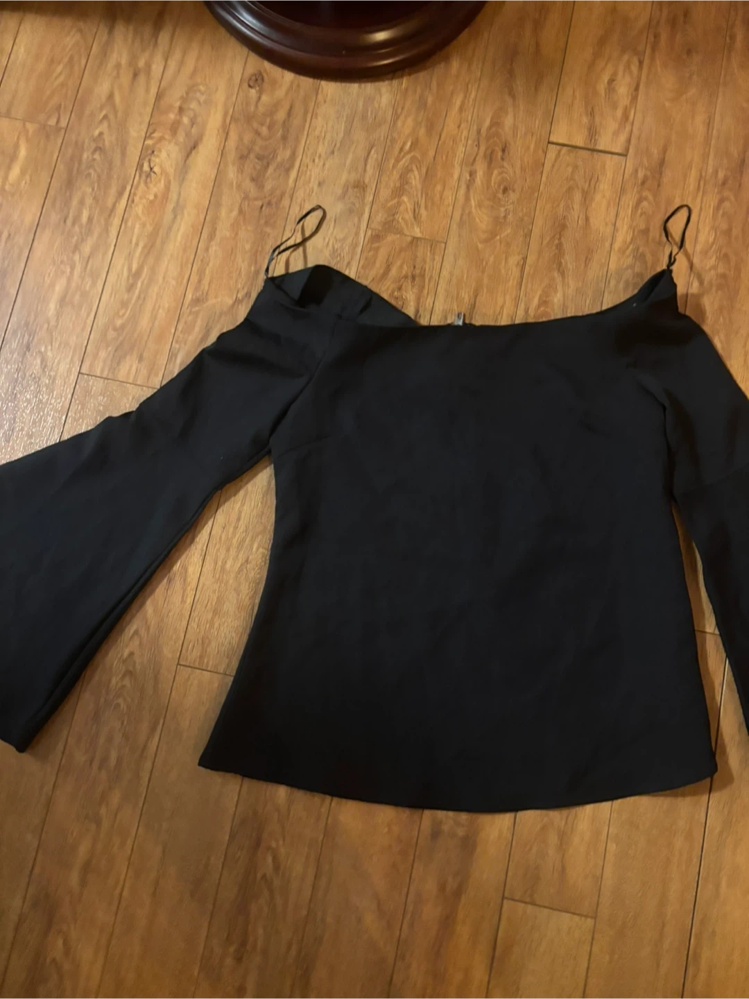 This Lulus black top features a stylish off-the-shoulder design with dramatic bell sleeves. It has a convenient back zipper closure. Size is small.