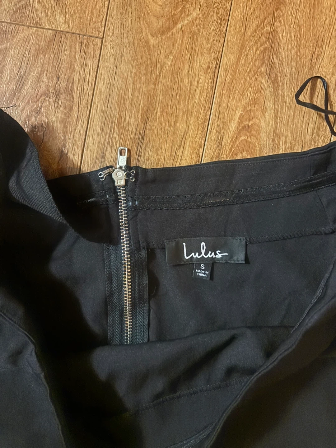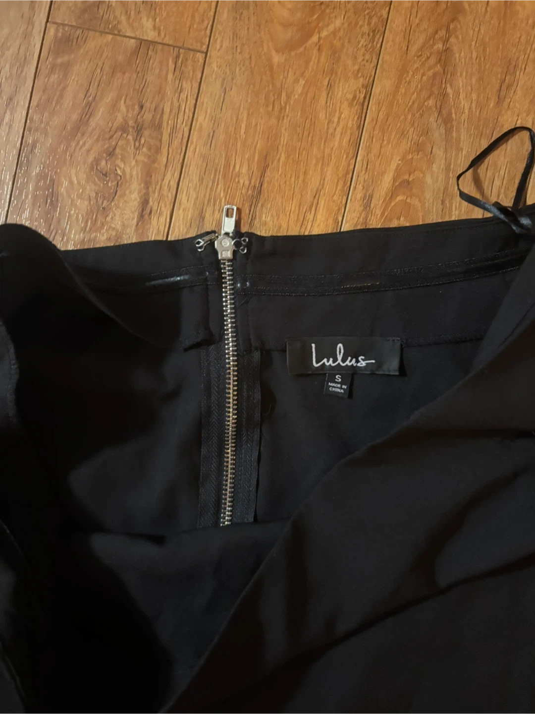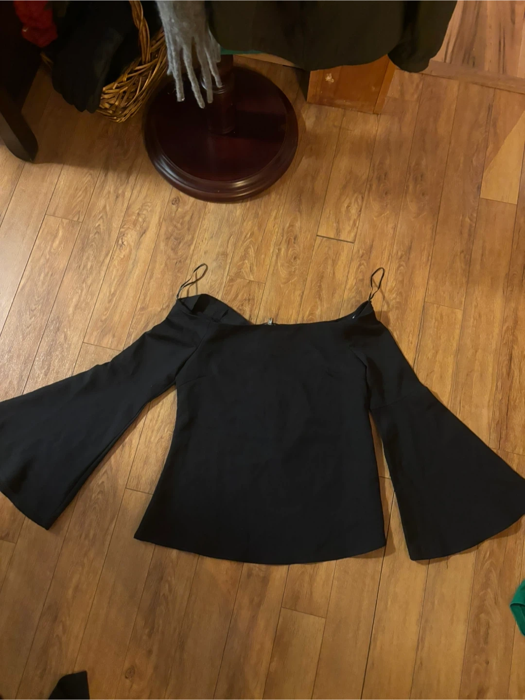This Lulus black top features a stylish off-the-shoulder design with dramatic bell sleeves. It has a convenient back zipper closure. Size is small.