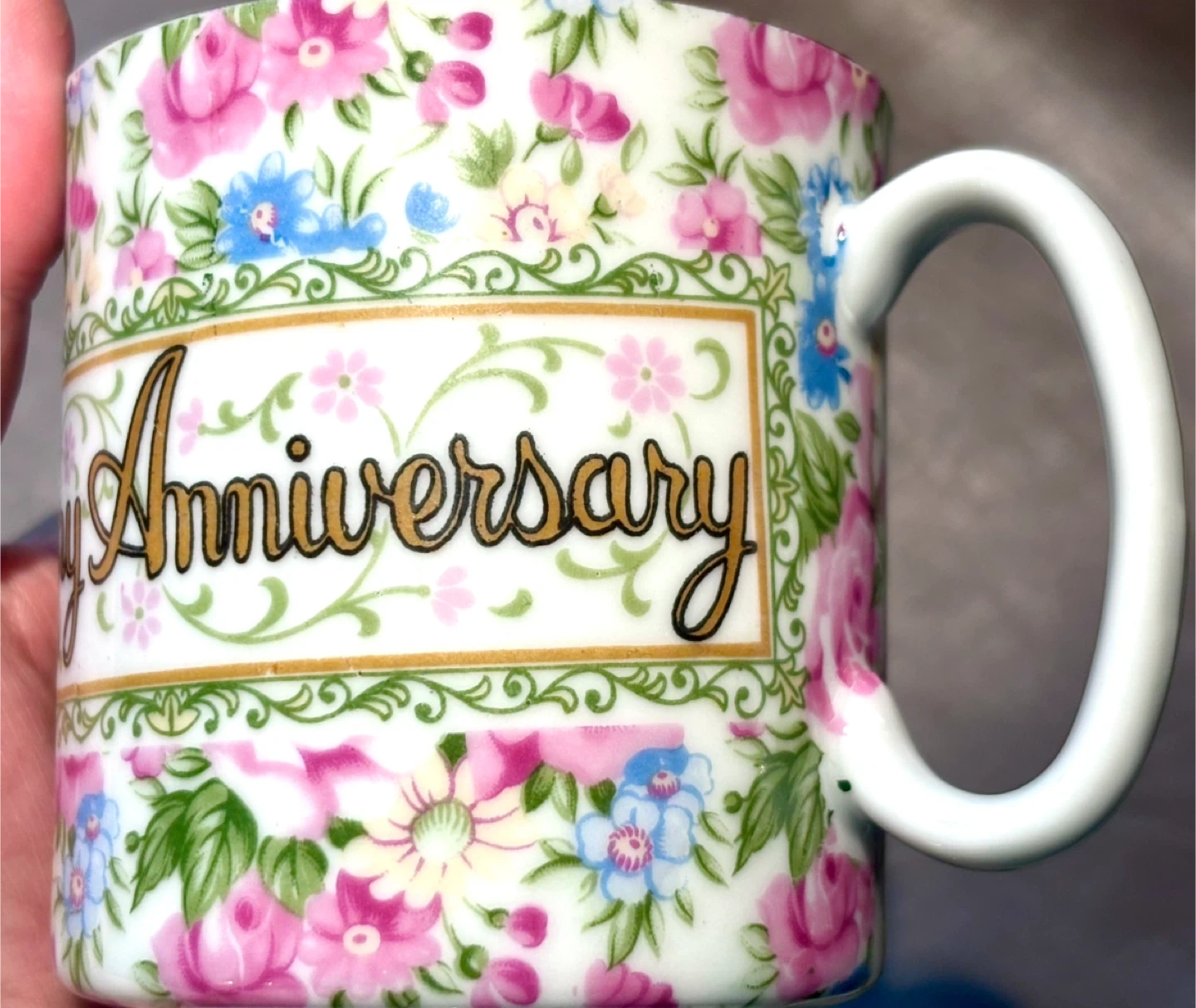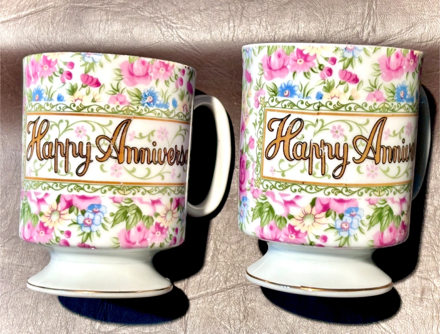 These mugs feature a lovely floral design with "Happy Anniversary" in elegant design.