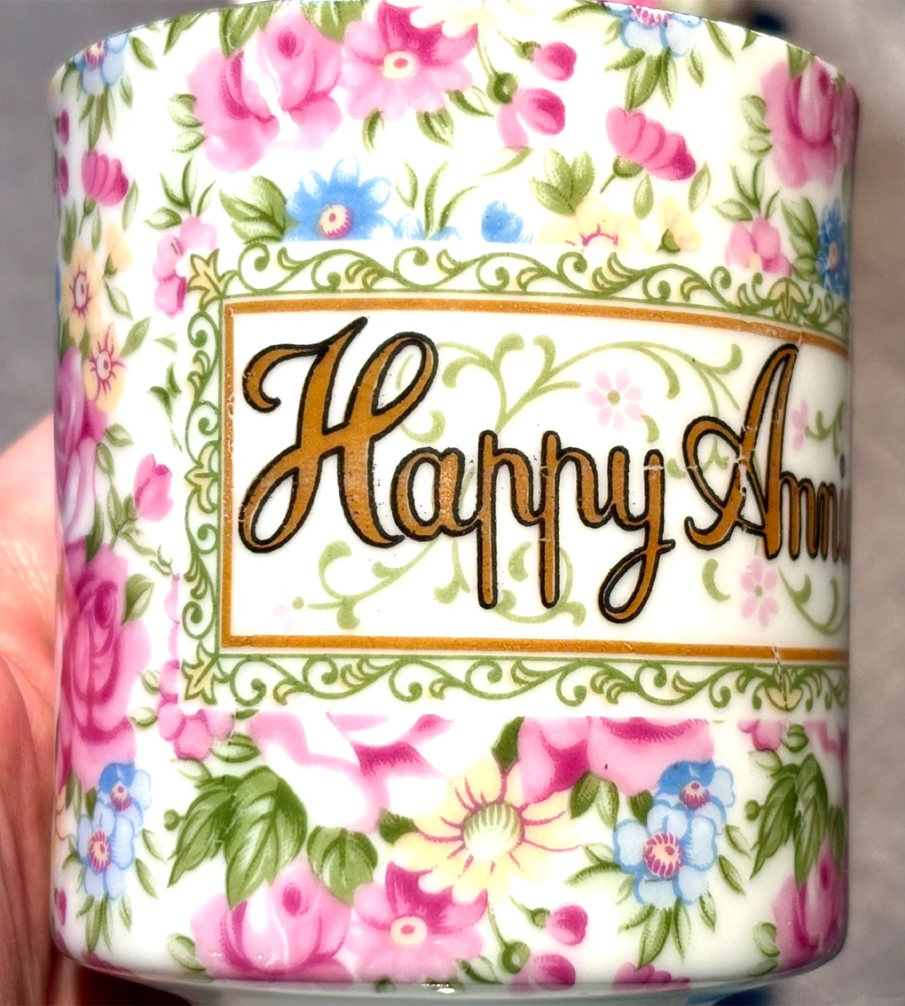 These mugs feature a lovely floral design with "Happy Anniversary" in elegant design.