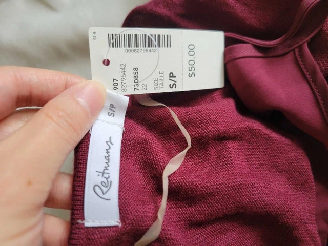 Add a touch of elegance to your wardrobe with this Reitmans sweater, featuring a stylish V-neck and long sleeves. This sweater is in new condition with the original tags still attached. Specifications: Size: S Colour: Red Brand: Reitmans Material: 60% Viscose 40% Acrylic. If the ad is up, it's still available!