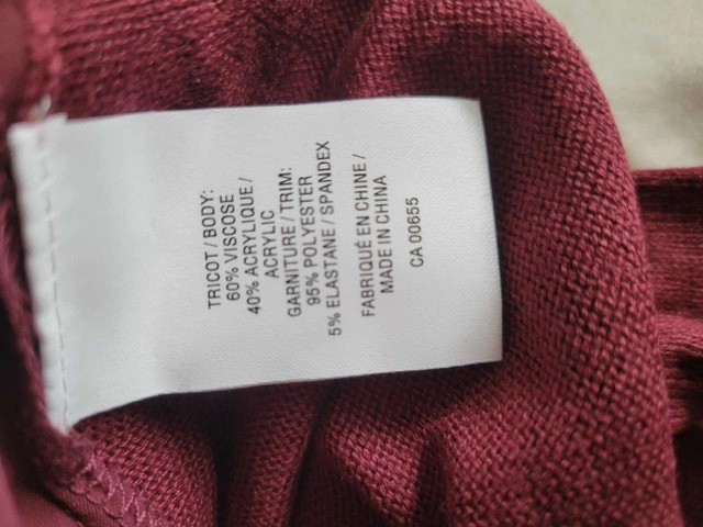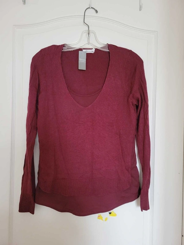 Add a touch of elegance to your wardrobe with this Reitmans sweater, featuring a stylish V-neck and long sleeves. This sweater is in new condition with the original tags still attached. Specifications: Size: S Colour: Red Brand: Reitmans Material: 60% Viscose 40% Acrylic. If the ad is up, it's still available!