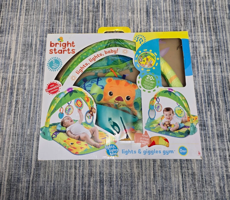 This Bright Starts Lights & Giggles Gym features lights and music to entertain your little one. It's designed for babies from 0 months and up. The gym includes multiple playful toys and a soft mat.