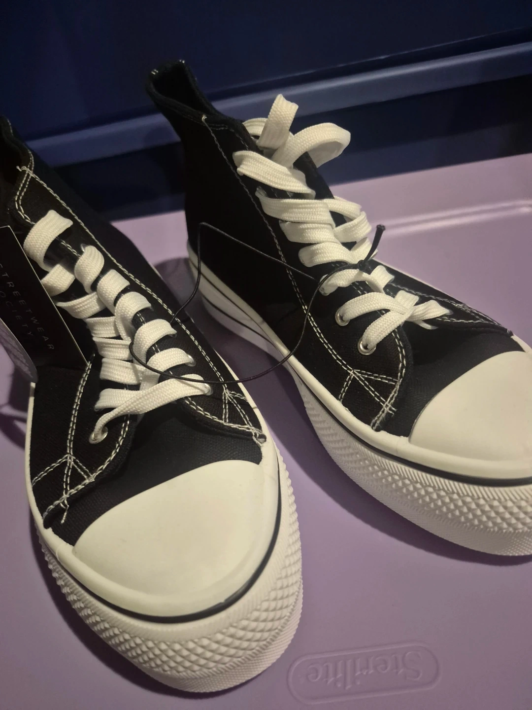 Black canvas high-top sneakers with white laces and soles. It's got a memory foam insole for extra comfort. These are great for everyday wear!