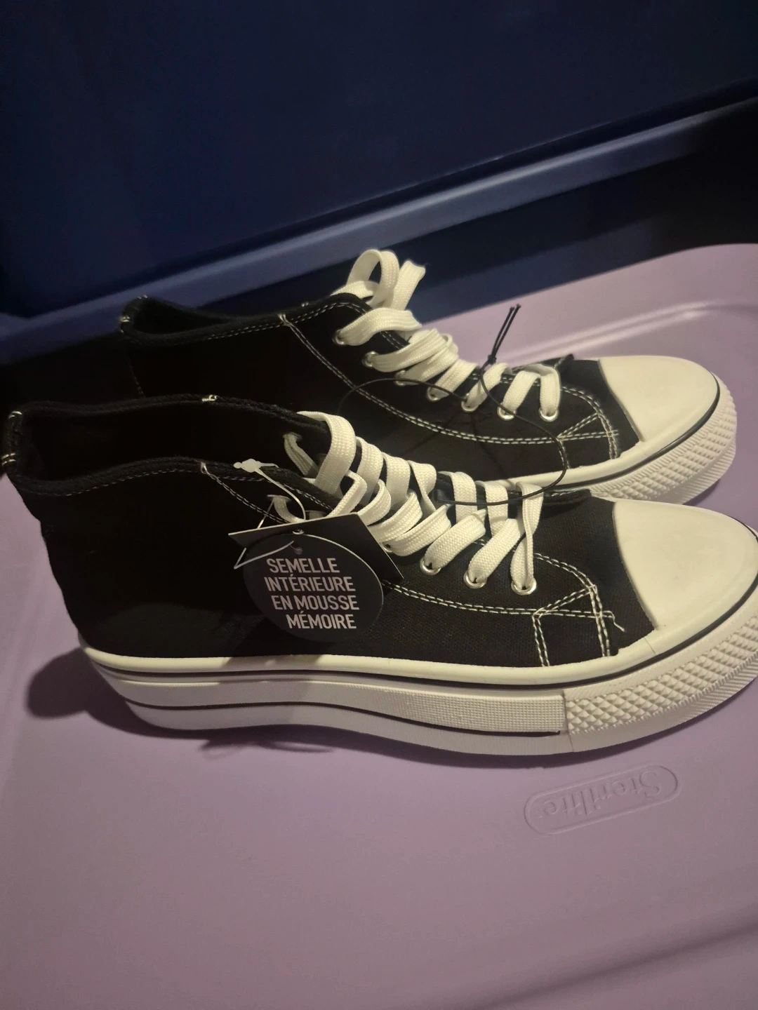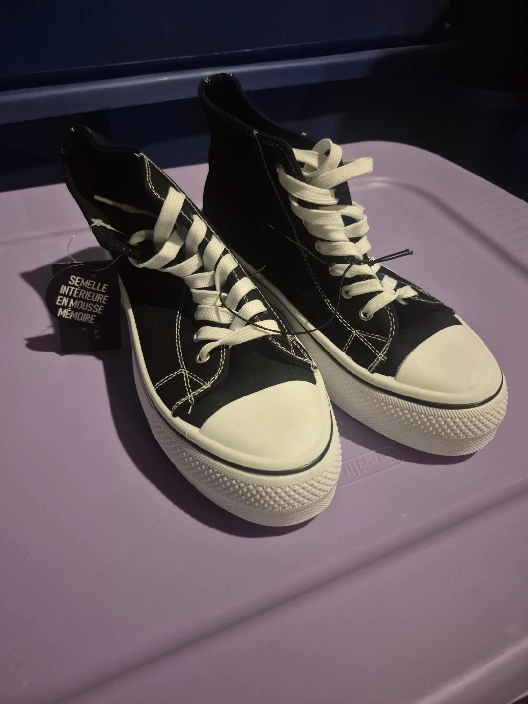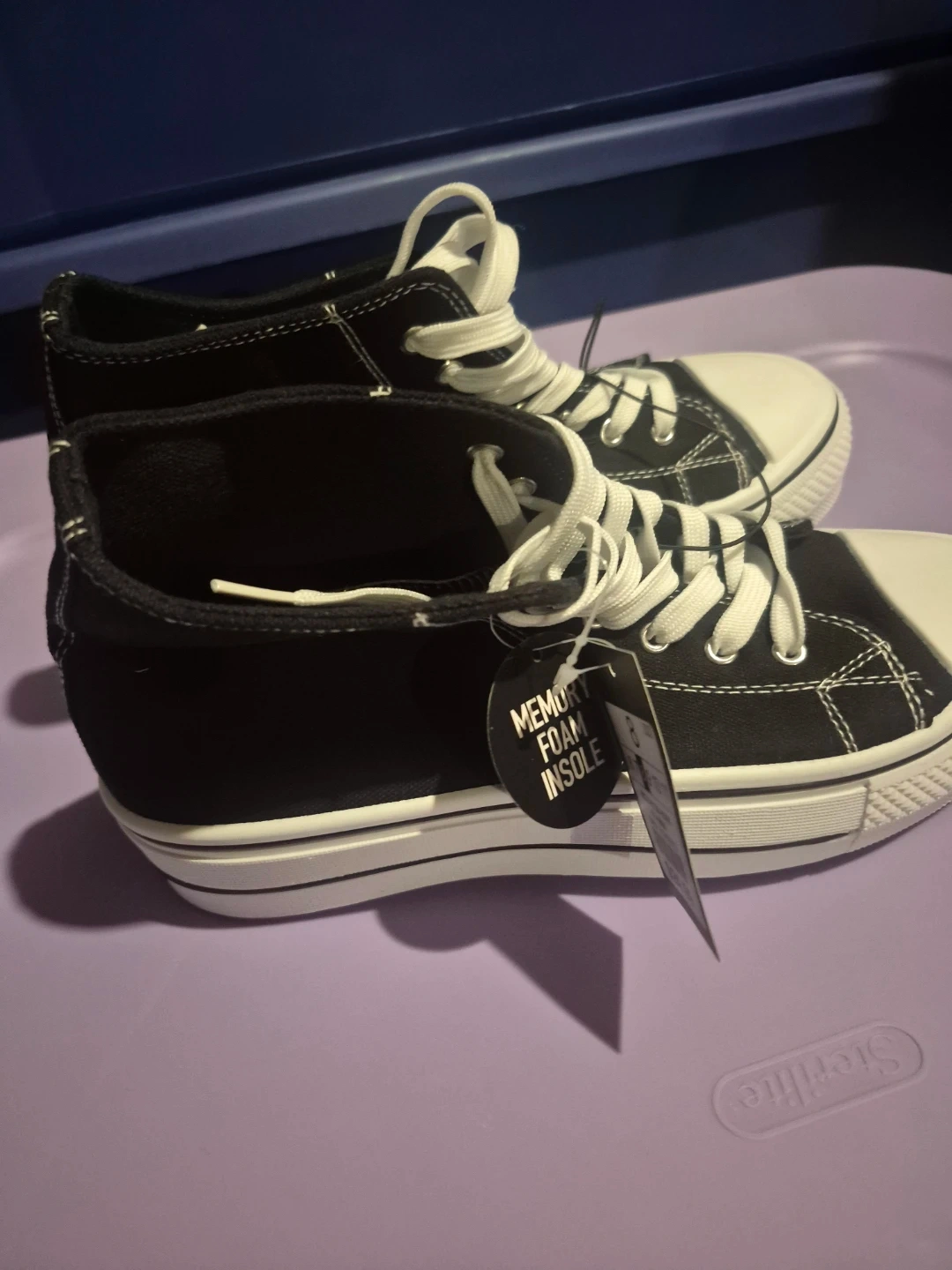 Black canvas high-top sneakers with white laces and soles. It's got a memory foam insole for extra comfort. These are great for everyday wear!