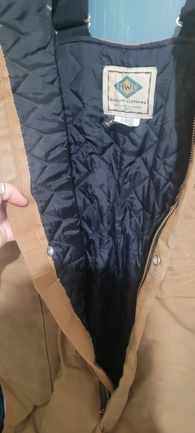 HWC insulated overalls in tan, size XL. Made in Canada with quilted lining for warmth. Features multiple pockets and adjustable straps.