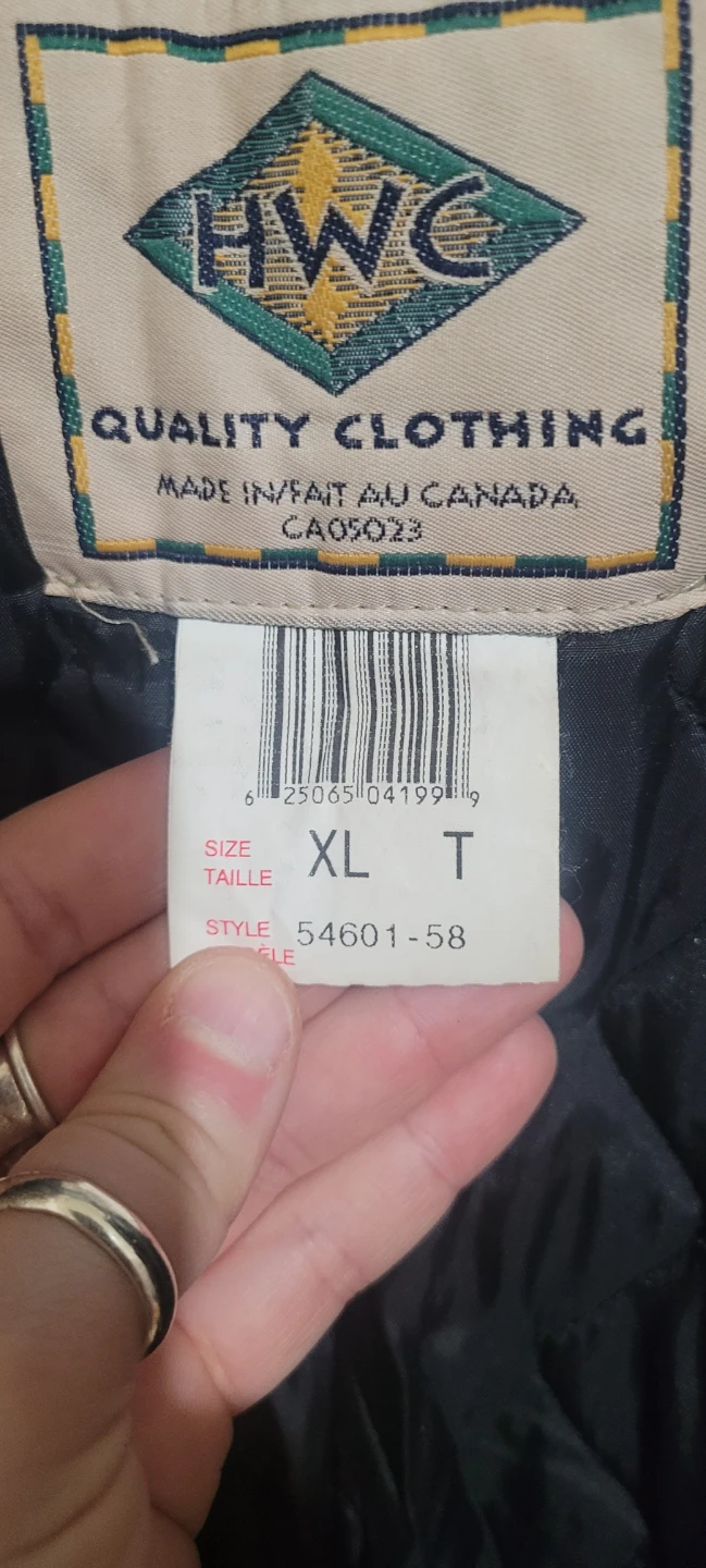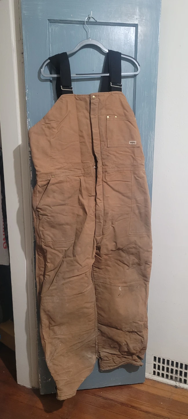 HWC insulated overalls in tan, size XL. Made in Canada with quilted lining for warmth. Features multiple pockets and adjustable straps.