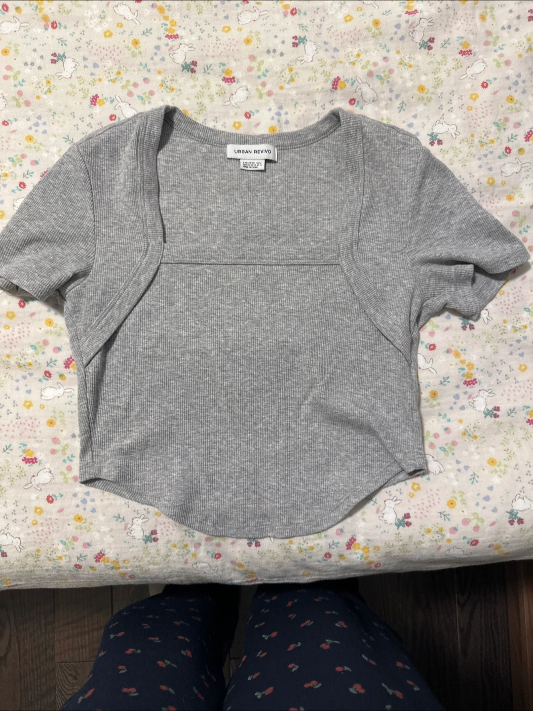 Selling a cute grey top from Urban Revivo! It's a size small and in great condition. The material is soft and ribbed, perfect for layering or wearing on its own. Let me know if you're interested!