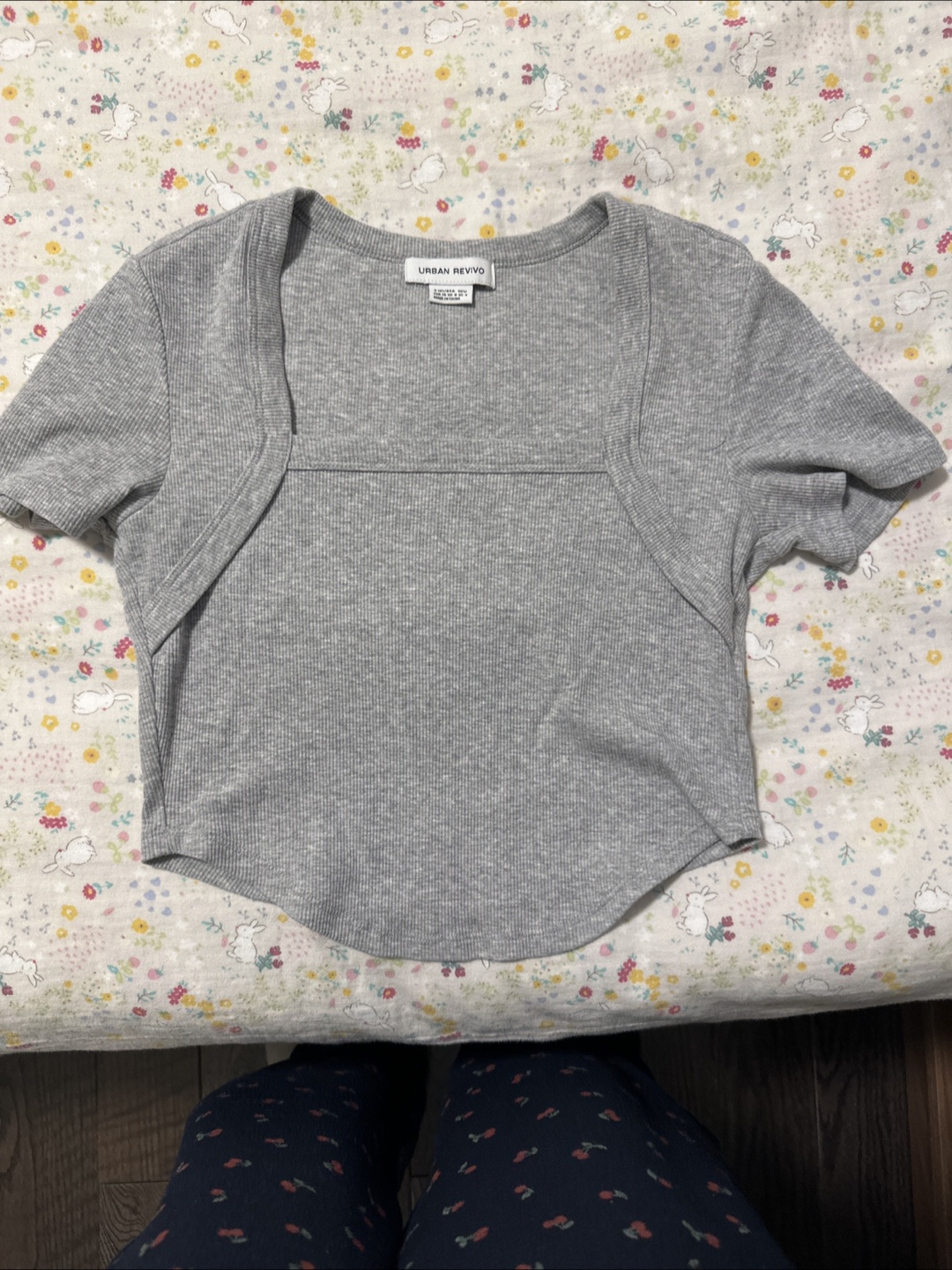 Selling a cute grey top from Urban Revivo! It's a size small and in great condition. The material is soft and ribbed, perfect for layering or wearing on its own. Let me know if you're interested!