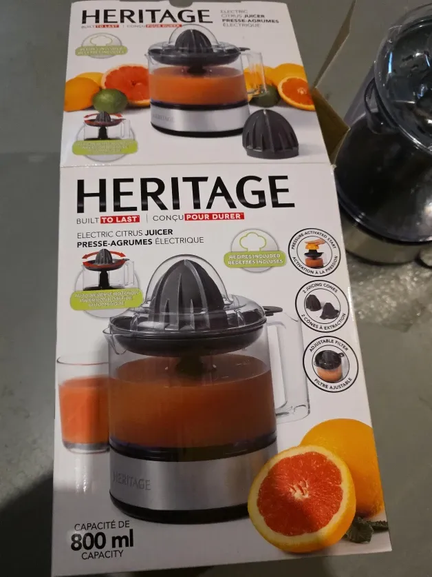 Selling a Heritage electric citrus juicer. It has a capacity of 800 ml and includes recipes. It also features pressure-activated start, two juicing cones, and an adjustable filter. Built to last!
