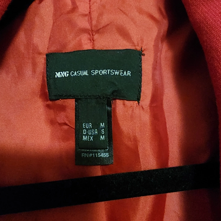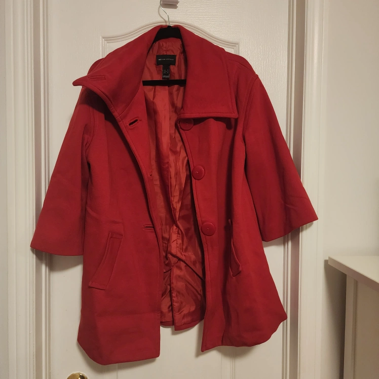 Women's red peacoat. Size small. Three-quarter sleeves. Collared. Button closure. Two front pockets.