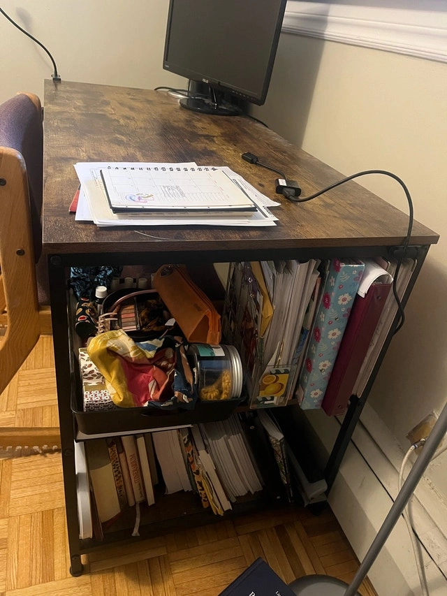 Large brown and metallic black desk with two shelves for plenty of storage. Easy to move and stylish. Like new.
