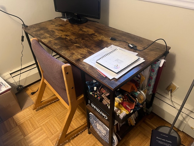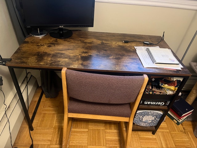 Large brown and metallic black desk with two shelves for plenty of storage. Easy to move and stylish. Like new.