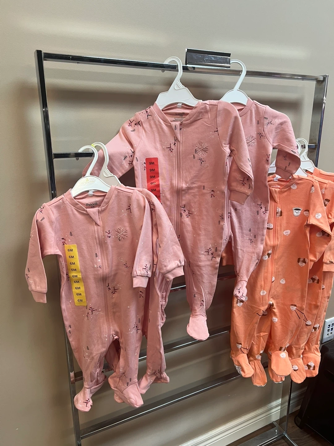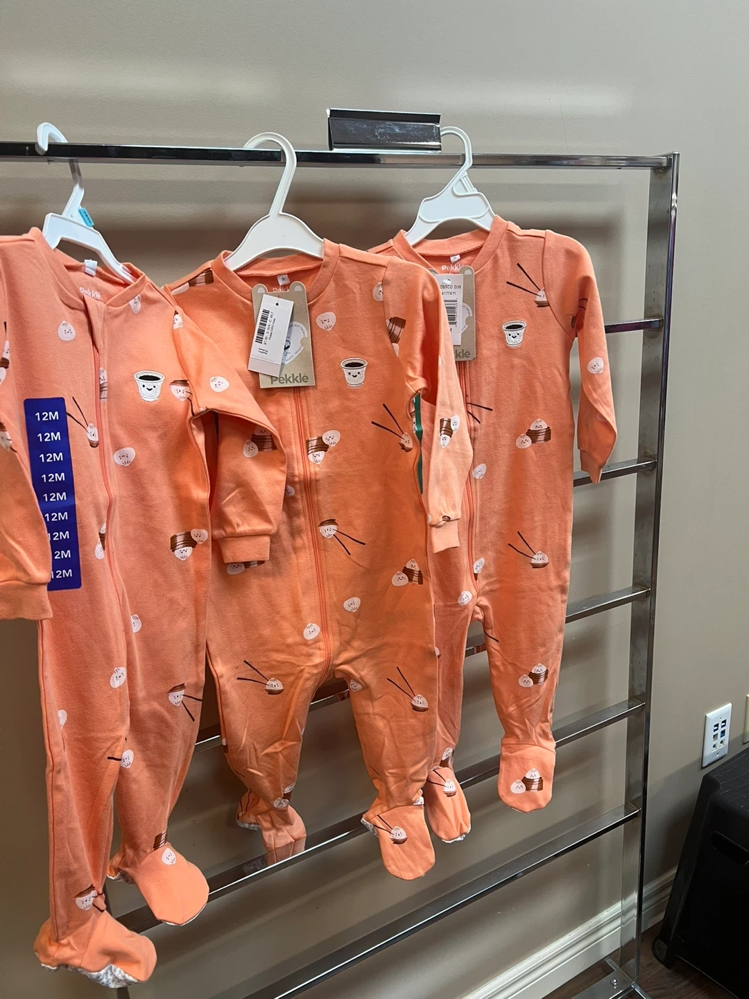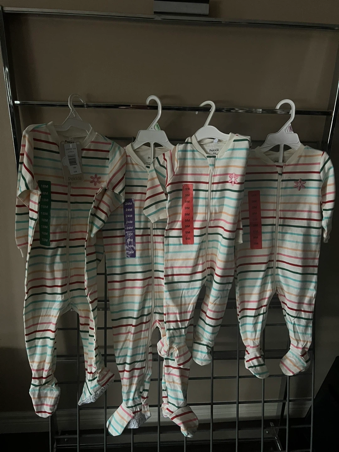 Organically grown cotton adorable baby sleepers from Pekkle. Comes with two pink patterned, two orange sushi print, and one striped sleeper. Perfect for keeping your little one cozy!