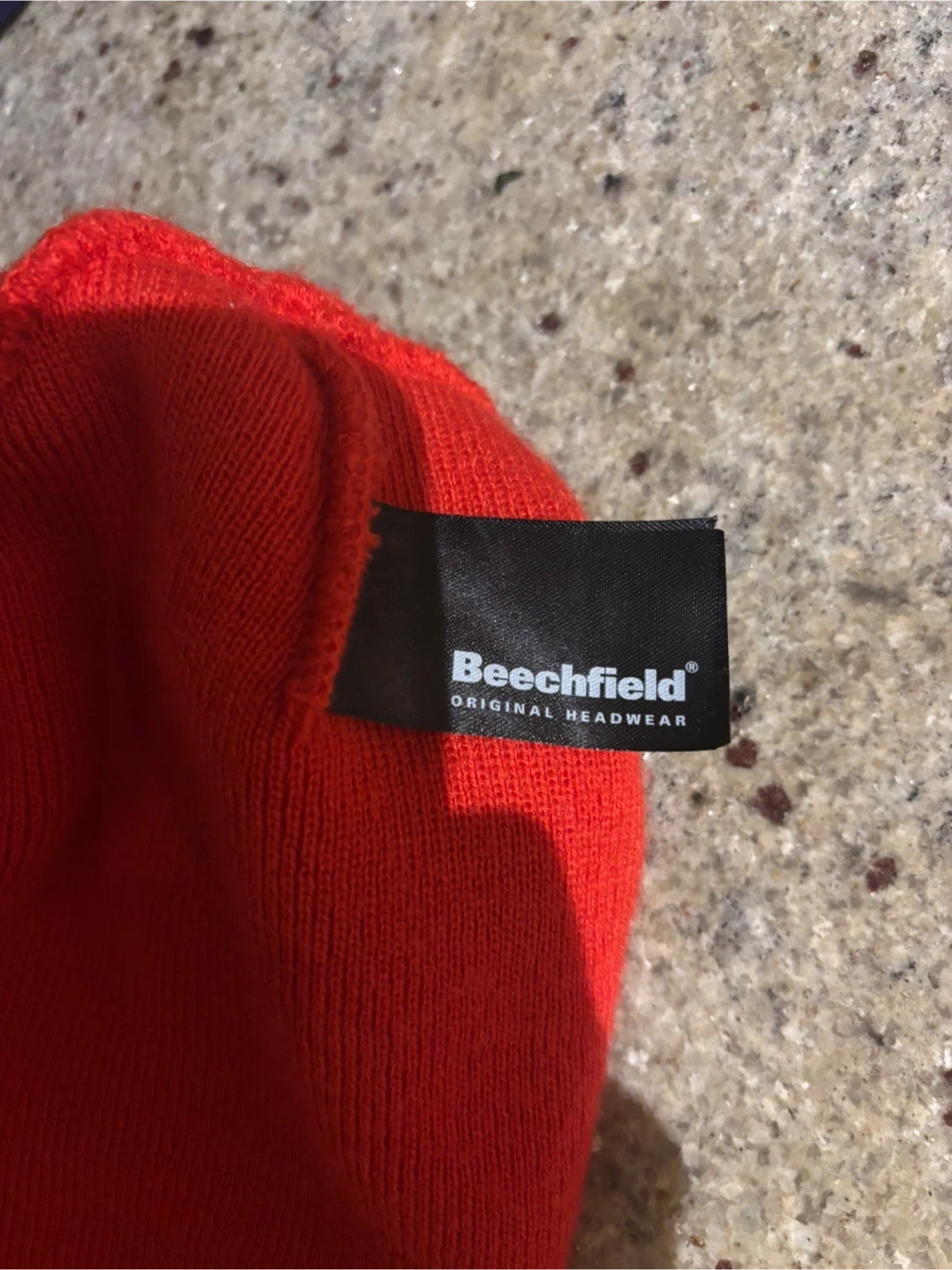 This is a red beanie from Beechfield Original Headwear. It's made of a knit material. It's suitable for keeping your head warm.