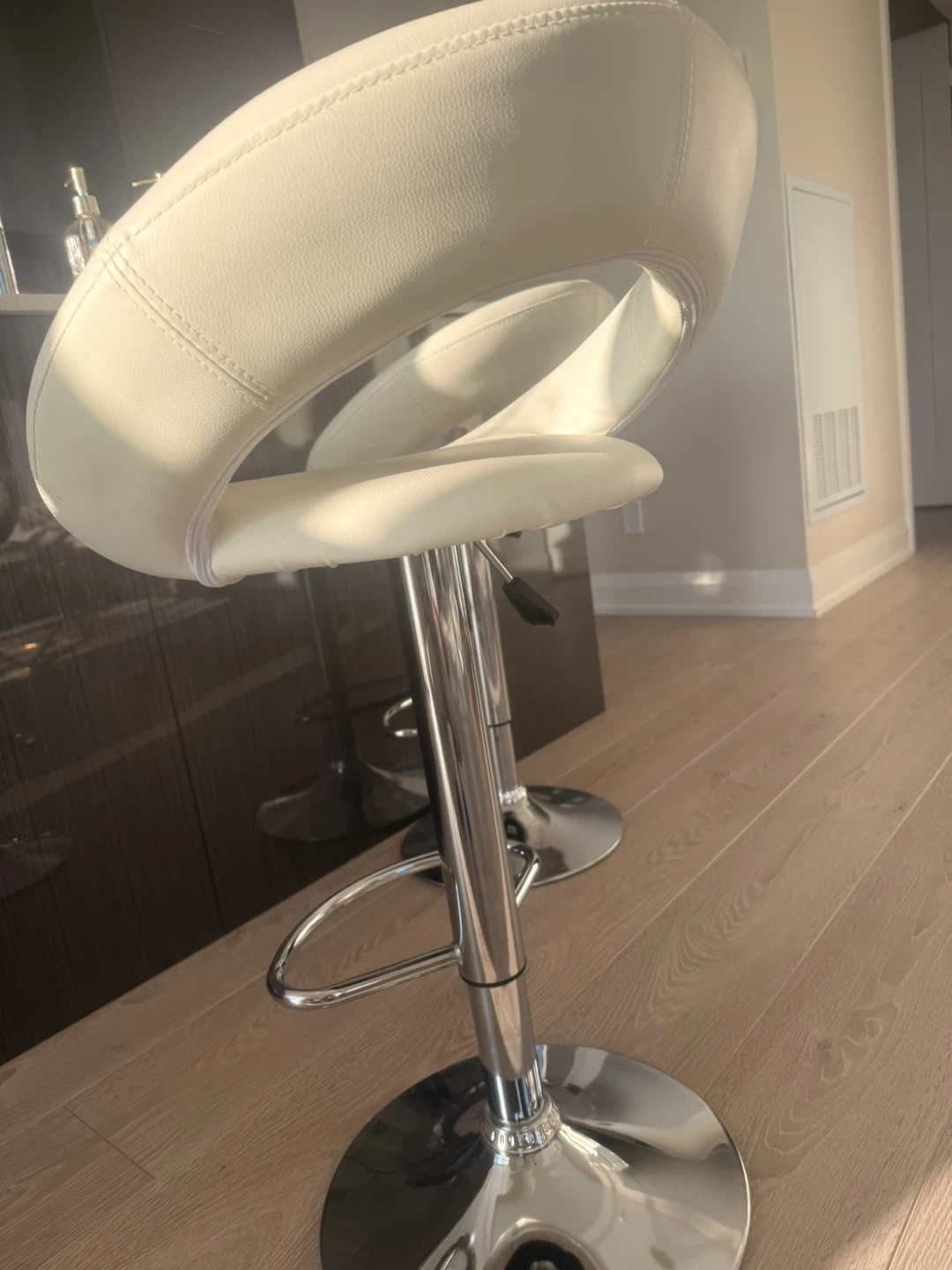 This set of white adjustable bar stools features a comfortable, padded seat and backrest. It has a chrome base and a built-in footrest for added convenience. The height is adjustable, making it suitable for most kitchen islands or bars. Small amount of discoloration seen seat of one barstool, shown in 2nd picture.