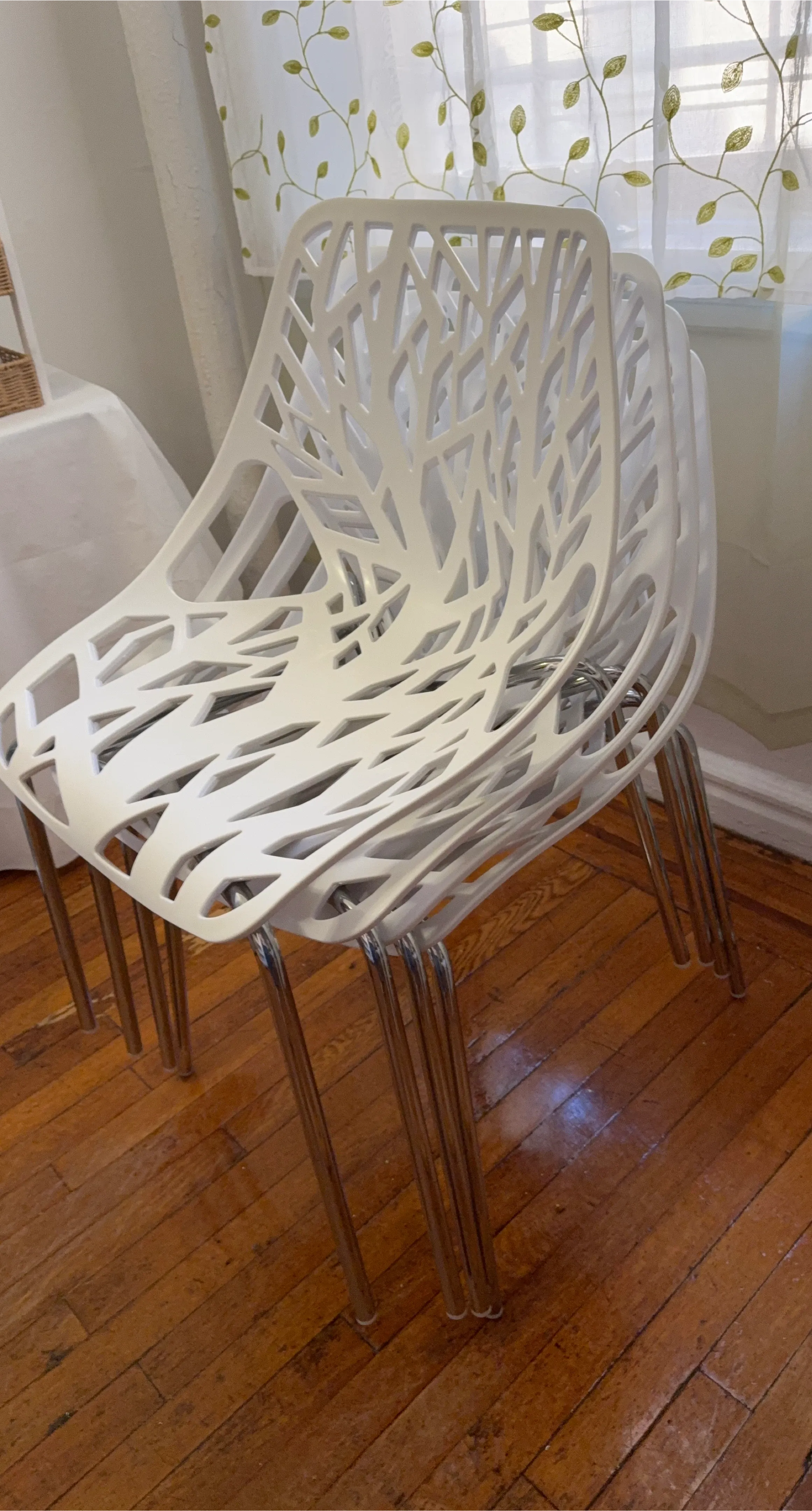 Stackable modern dining chairs in white. These chairs feature a unique, open-weave design and sturdy chrome legs. Perfect for adding a stylish touch to any dining area or patio. They're easy to clean and store!
