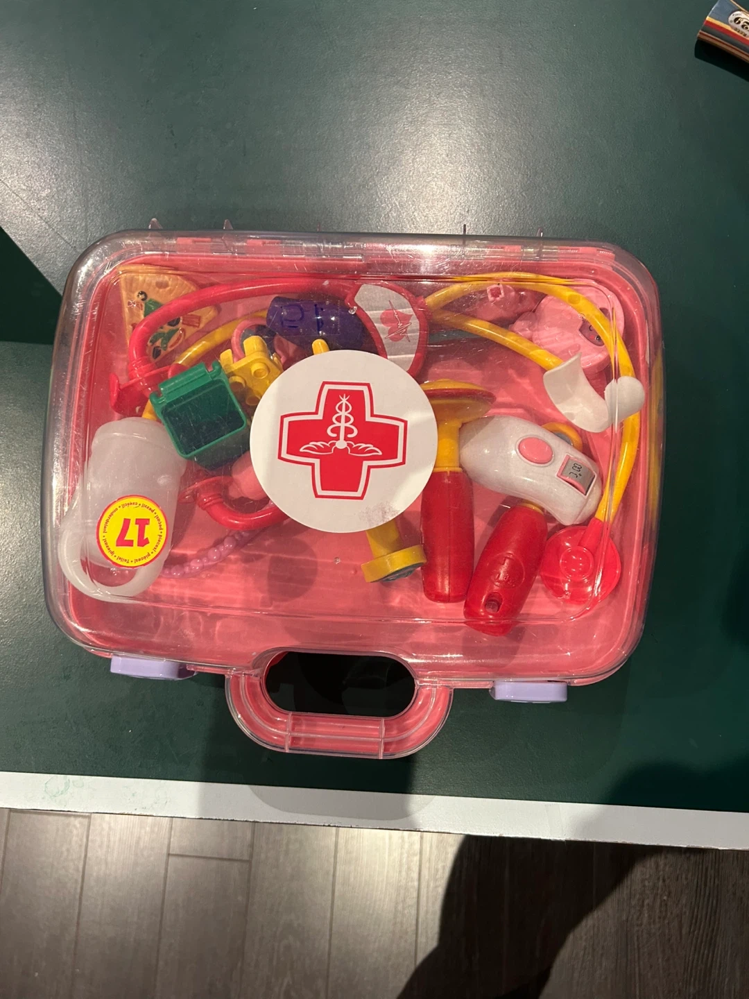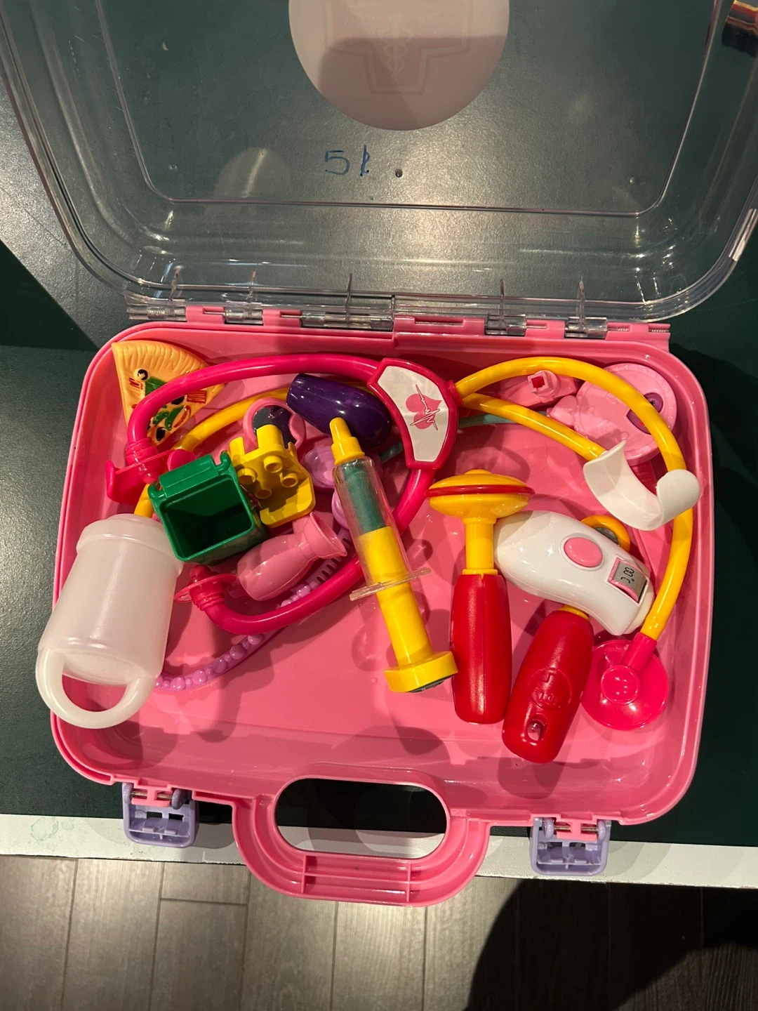 This pink doctor's kit has a stethoscope, syringe, and other medical accessories. It's a fun toy for aspiring healthcare professionals. The case latches securely for easy transport.