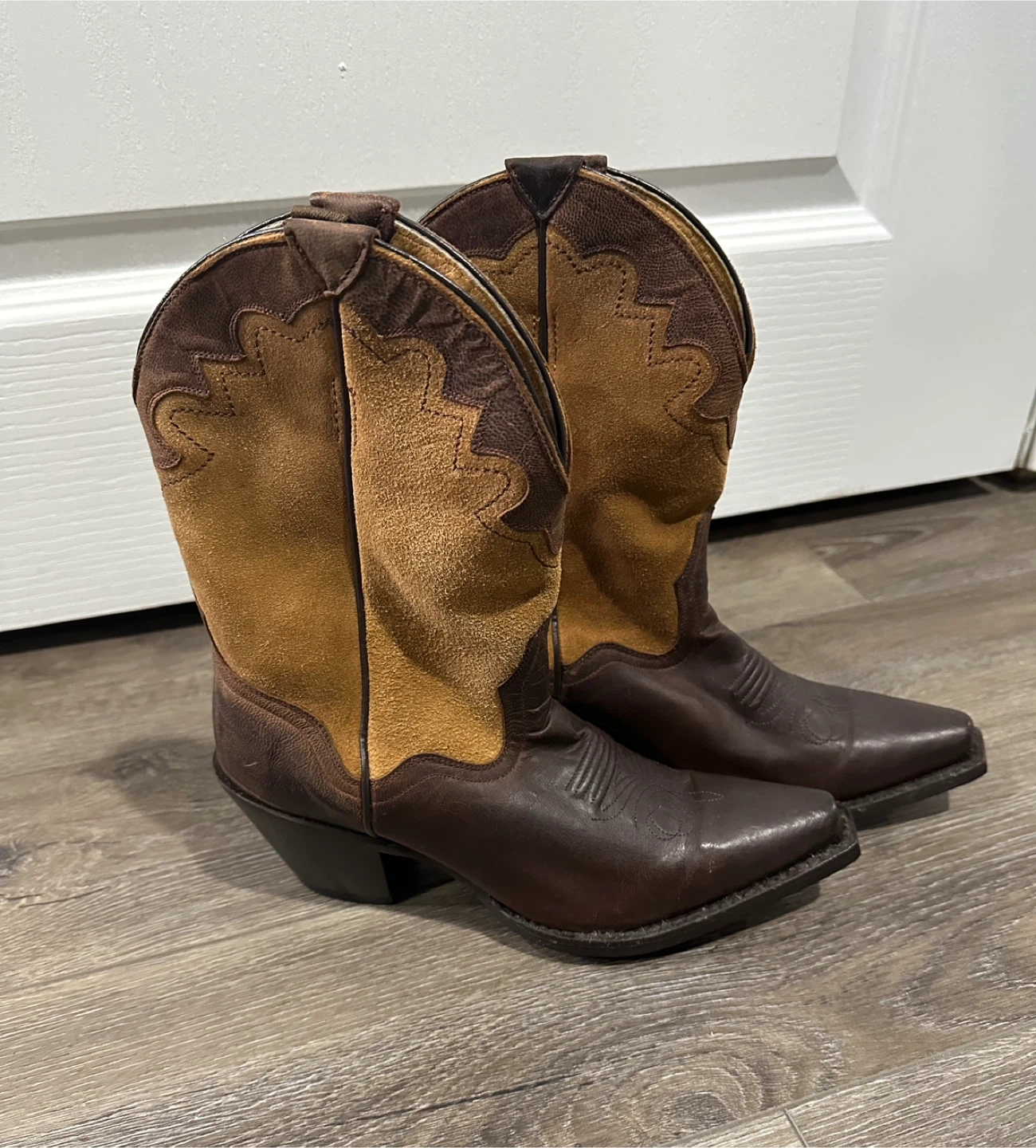 Selling a pair of women’s J.B. Dillon cowboy boots in size 7.5. These boots are made in Mexico and feature a stylish two-tone brown design. They are in great condition!