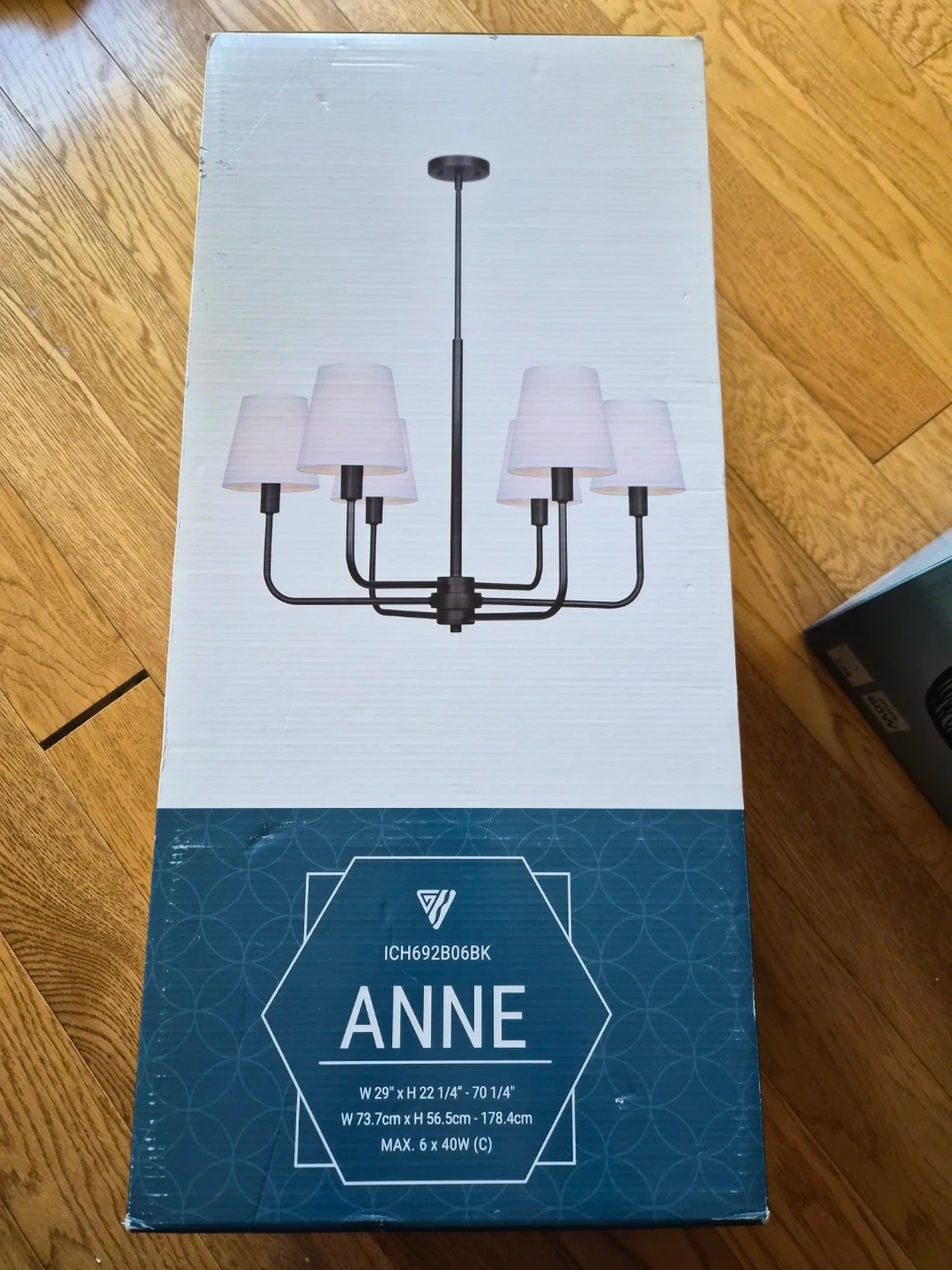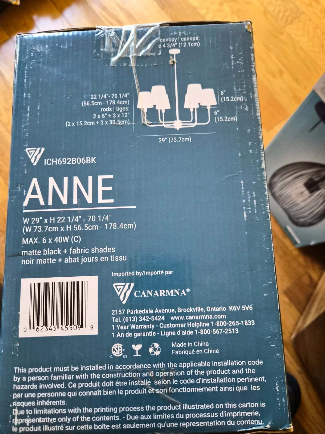 Selling a Canarm ANNE chandelier in matte black with fabric shades. The dimensions are W 29" x H 22 1/4" - 70 1/4" (W 73.7cm x H 56.5cm - 178.4cm). It supports a maximum of 6 x 40W (C) bulbs. The box is included!