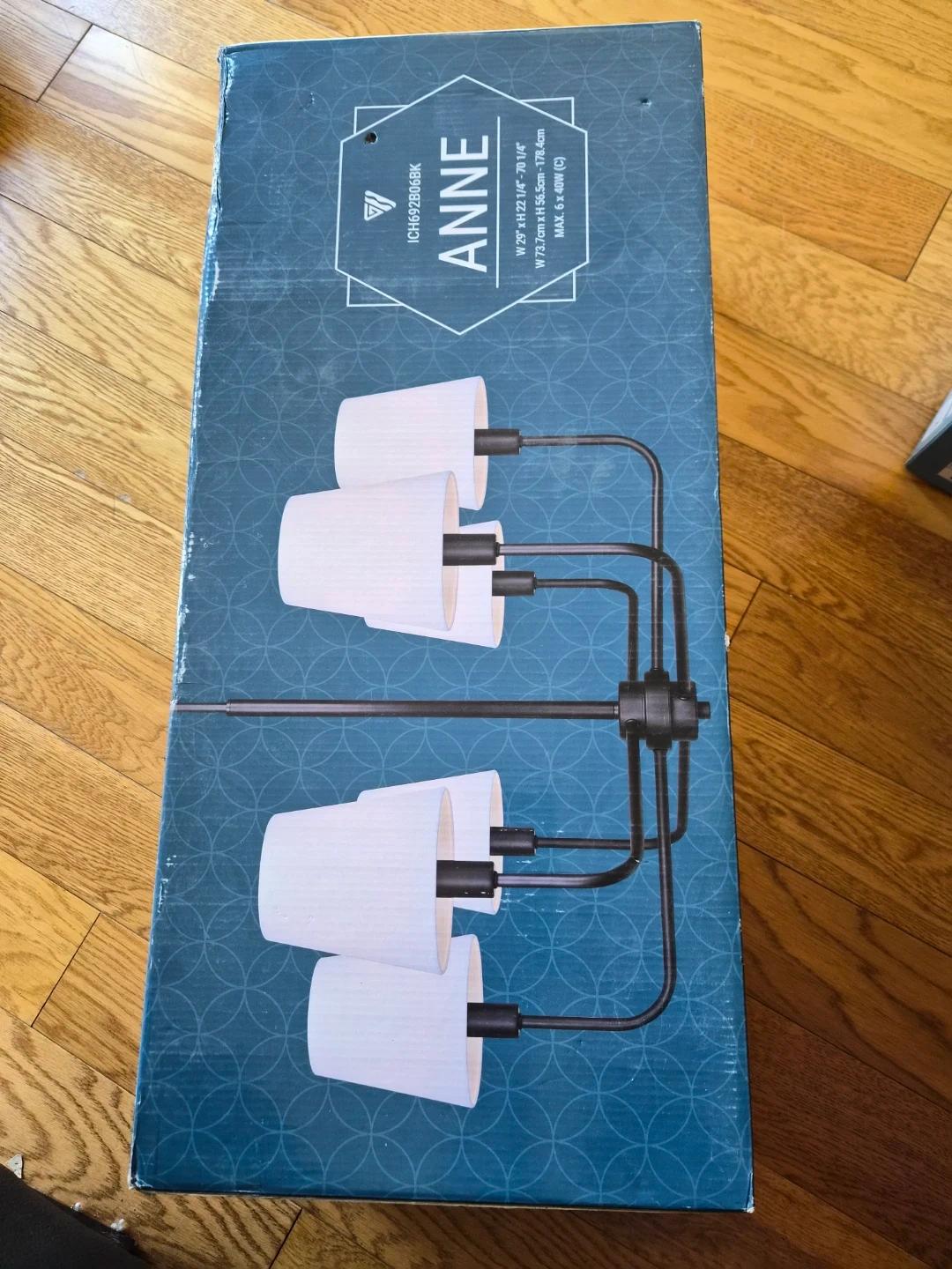 Selling a Canarm ANNE chandelier in matte black with fabric shades. The dimensions are W 29" x H 22 1/4" - 70 1/4" (W 73.7cm x H 56.5cm - 178.4cm). It supports a maximum of 6 x 40W (C) bulbs. The box is included!