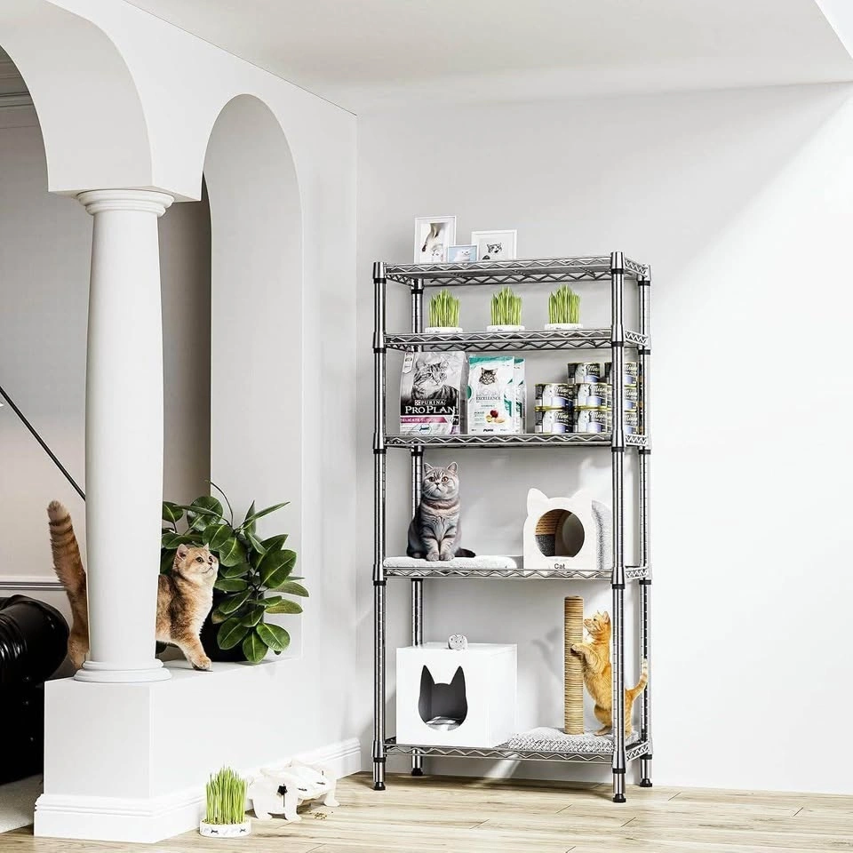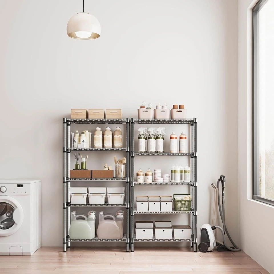 This storage shelf is designed to maximize efficiency in small spaces. Its multiple wire shelves provide ample vertical storage capacity, making it an ideal choice for narrow areas or corners. Crafted from high-quality carbon steel with 19.1mm pipes for improved load-bearing capacity, stability, and durability. Each shelf holds up to 250 LBs. The shelving units offer incredible versatility, suitable for use in a garage, balcony, pantry, and kitchen. Its special coating ensures water resistance, making it accommodated for humid environments like bathrooms. The build allows for height adjustments, allowing you to customize it to your needs. You can easily assemble the storage rack according to the instructions. No tools are required.