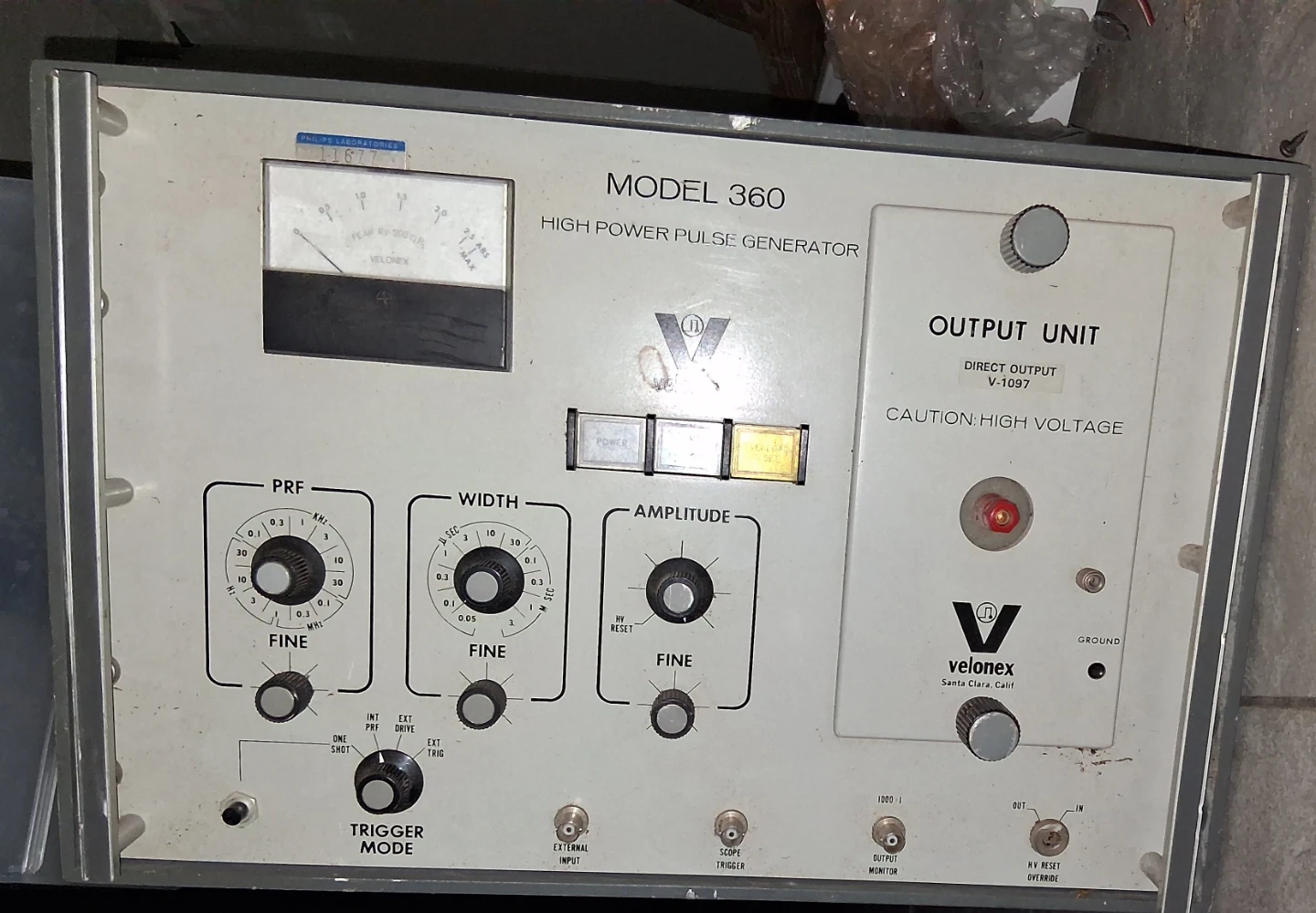 This is a Velonex Model 360 High Power Pulse Generator. It features adjustable amplitude, width, and pulse rate controls. It's a direct output unit V-1097.