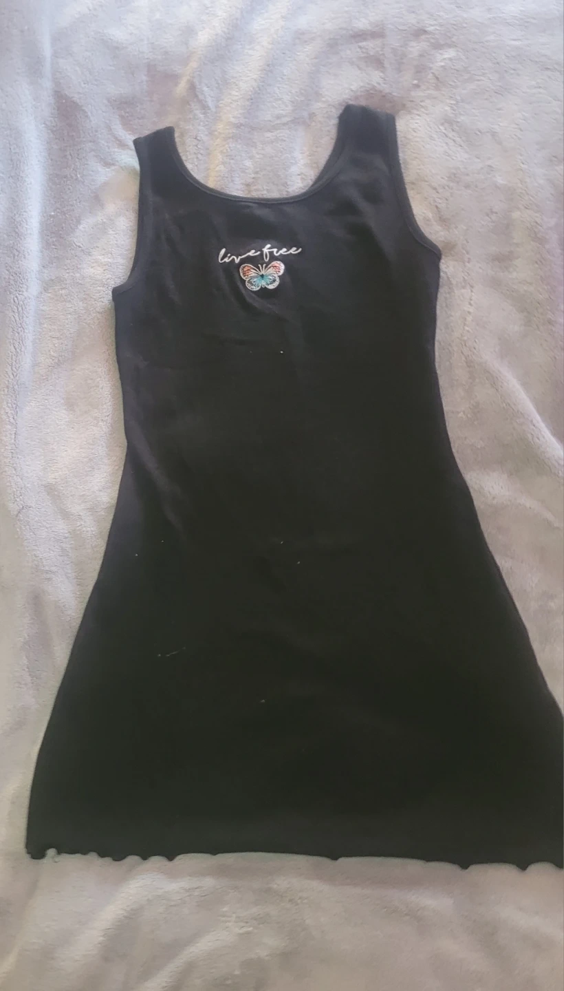 Two girls' sleeveless dresses, one black with 'live free' and butterfly graphic, and one green with 'Good Vibes' graphic. Both have lettuce hem detail. Cotton blend material.