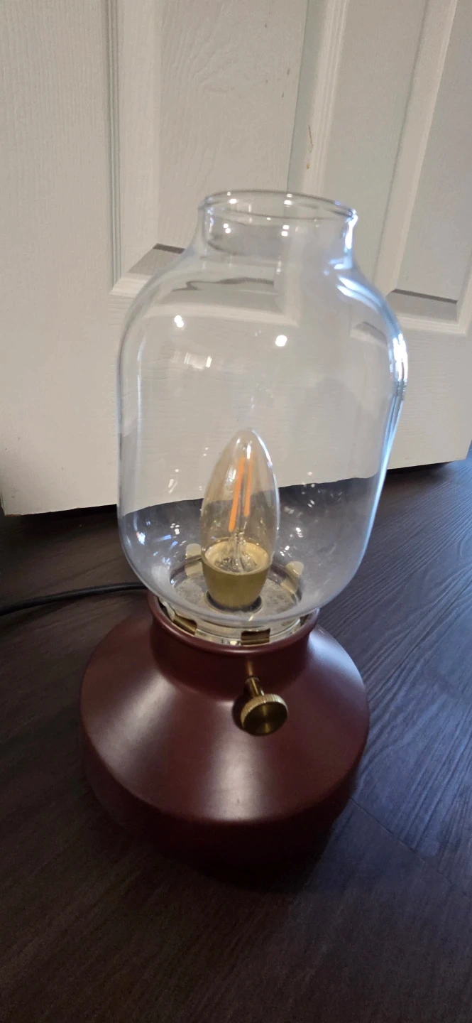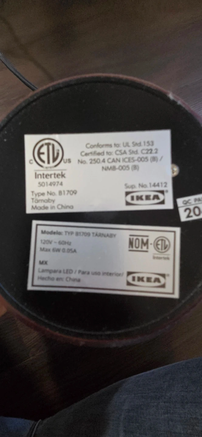 This is an IKEA B1709 TARNBY table lamp. It's made with a glass shade and a dark red base. The lamp uses a 120V, max 6W LED bulb. It's a nice accent light for any room!
