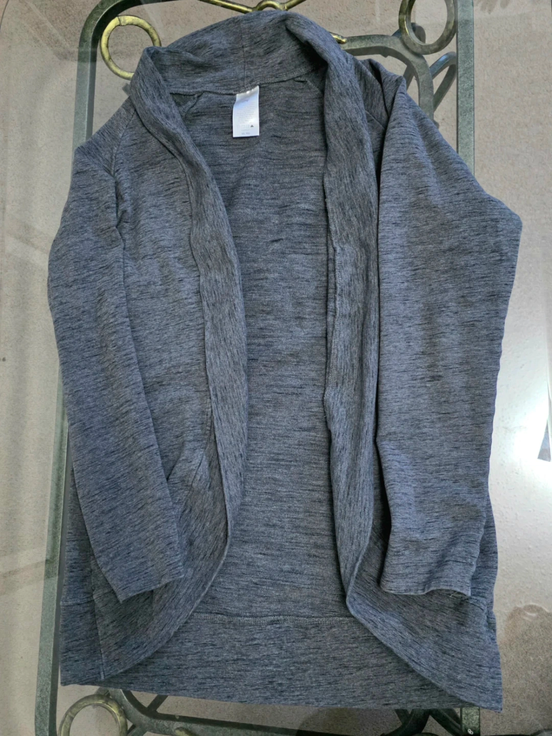 Style: Super soft, dark grey heathered open-front cardigan with a beautiful drape. Incredibly comfortable and perfect for throwing on over your gym clothes or leggings.