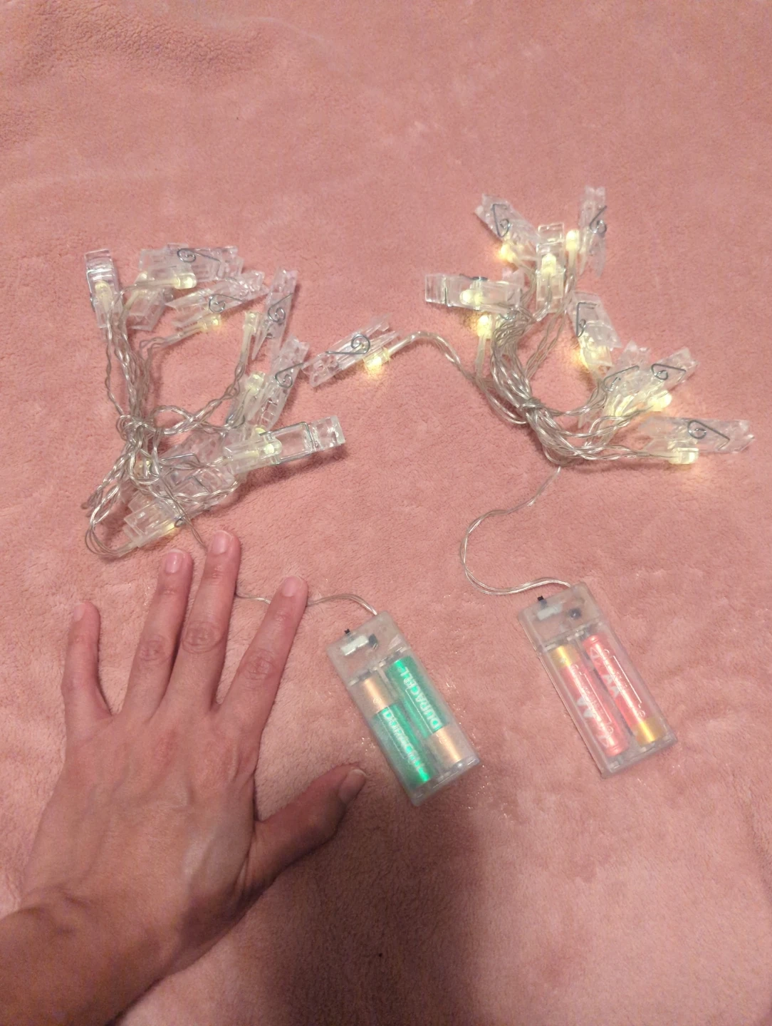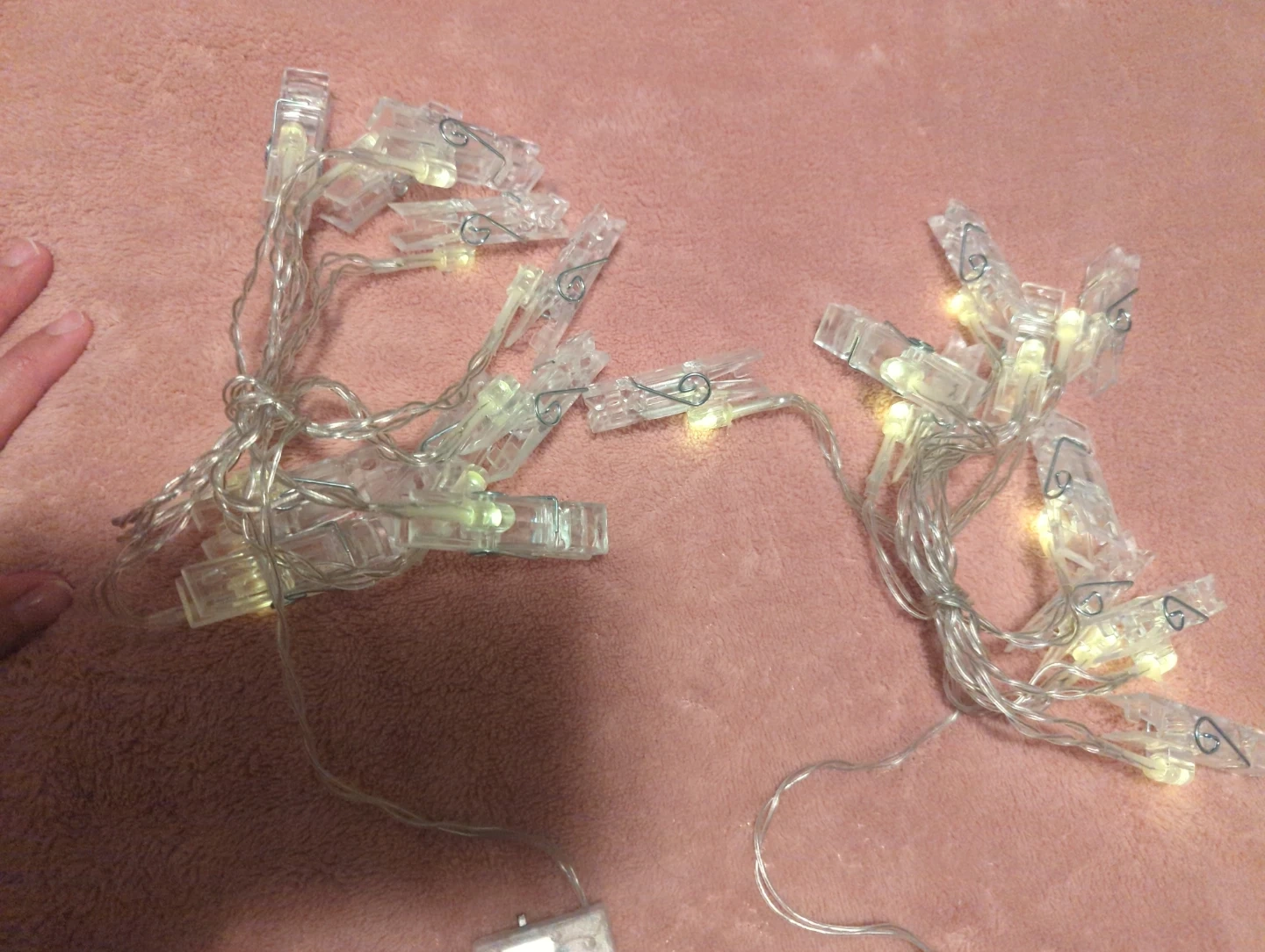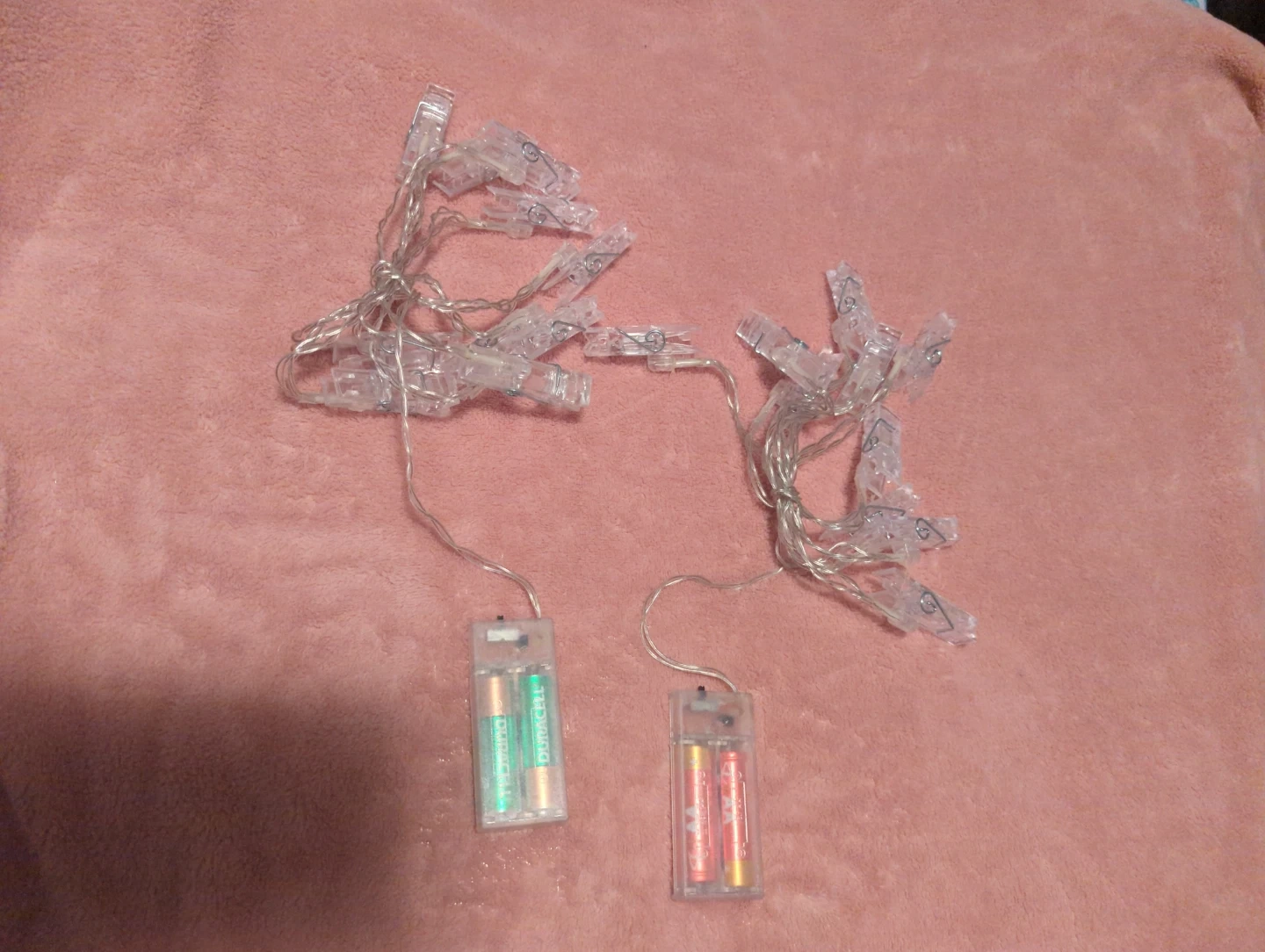 Two strings of battery-operated LED photo clip lights. Each string has clear clips to hold photos. Uses AA batteries, not included.