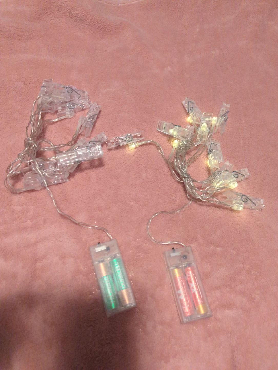 Two strings of battery-operated LED photo clip lights. Each string has clear clips to hold photos. Uses AA batteries, not included.