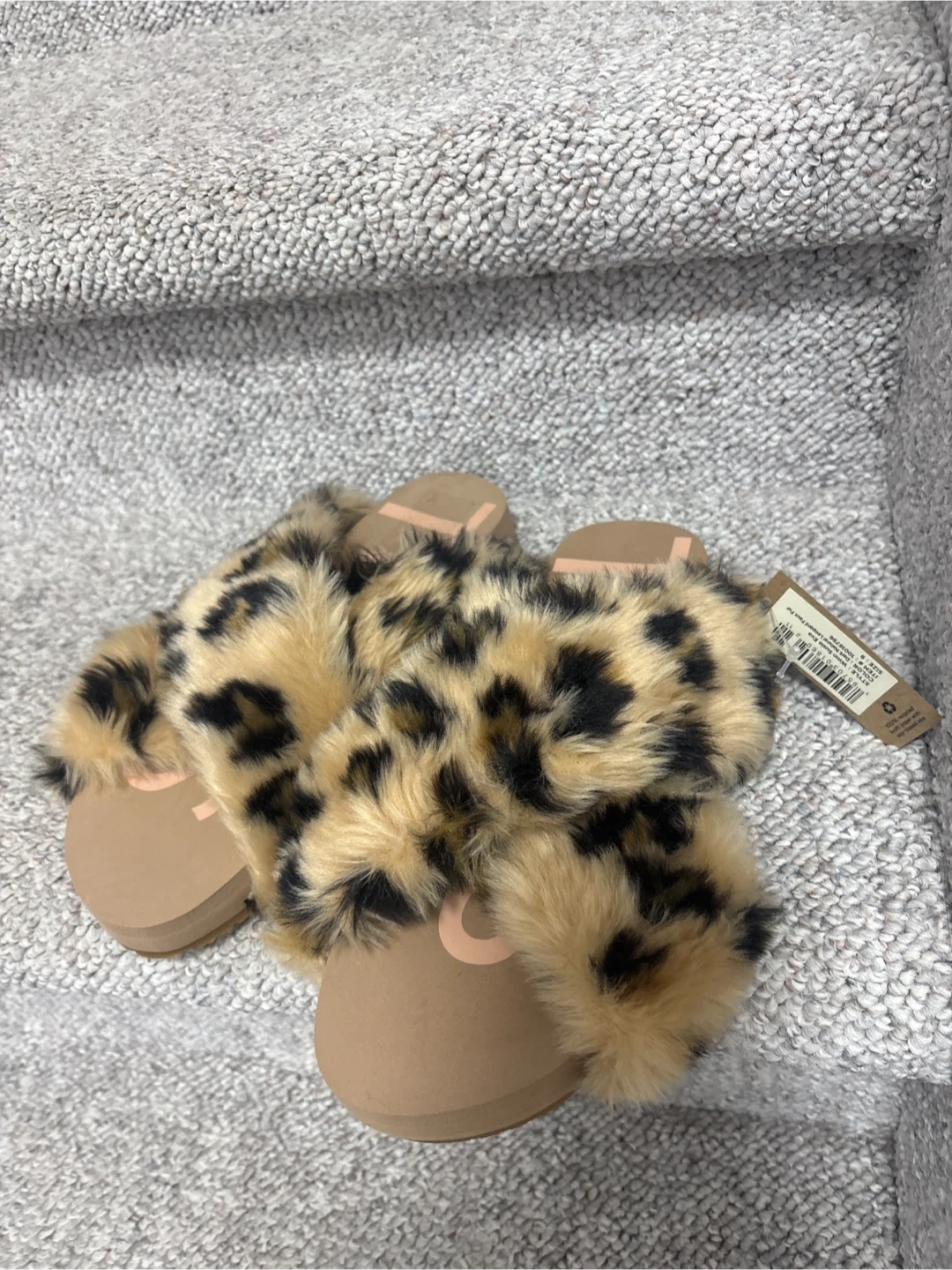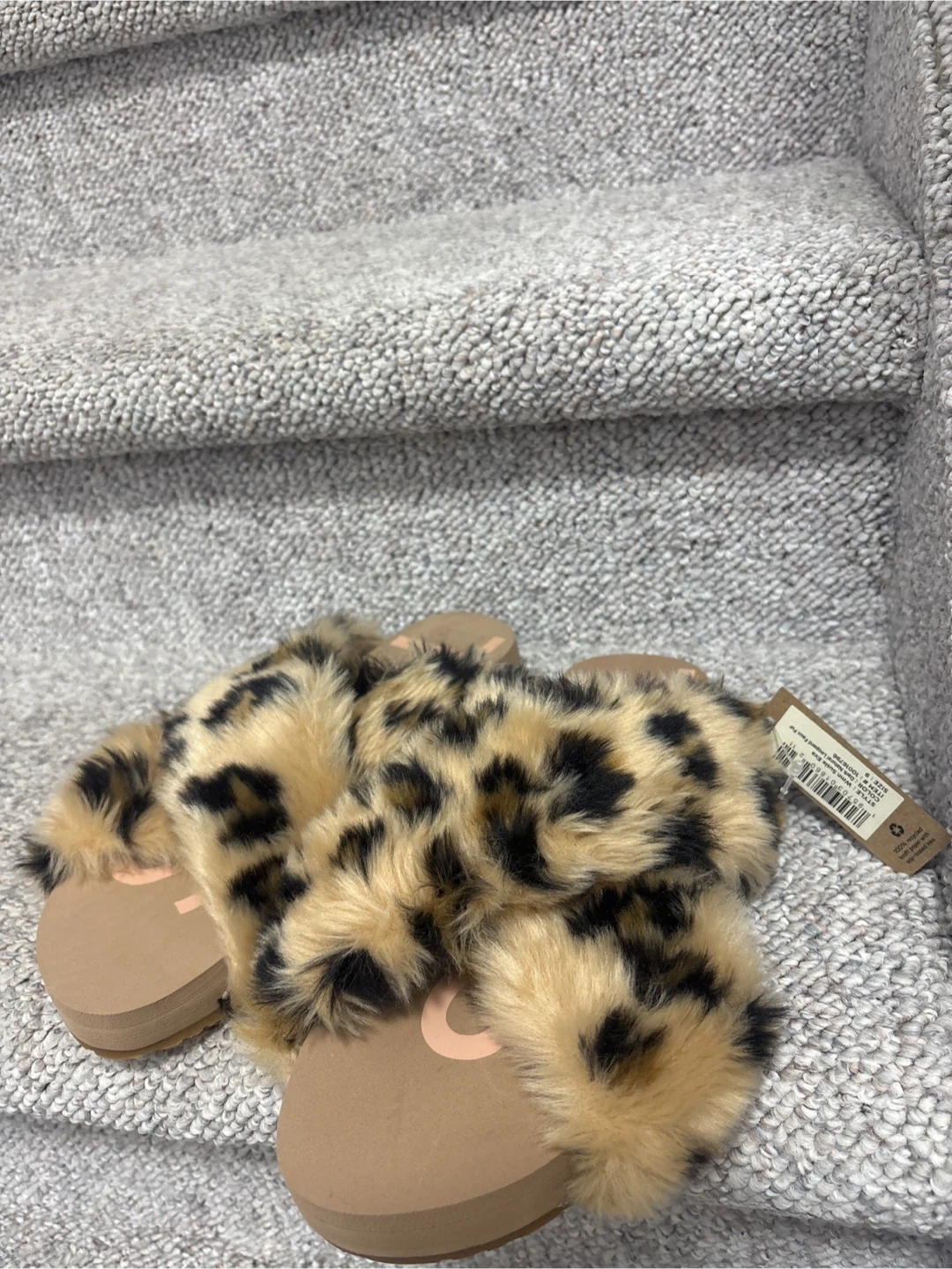 Cozy faux fur slippers with a fun leopard print. These slides feature a comfortable tan sole. Great for lounging around the house! Brand new pick up cash only size 9