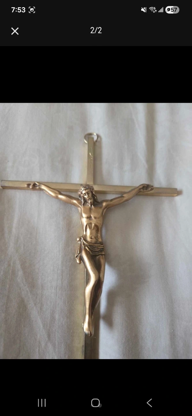 This is a wall-mounted crucifix. It features a depiction of Jesus Christ on the cross. It appears to be made of metal. Pickup only mississauga $5 firm.