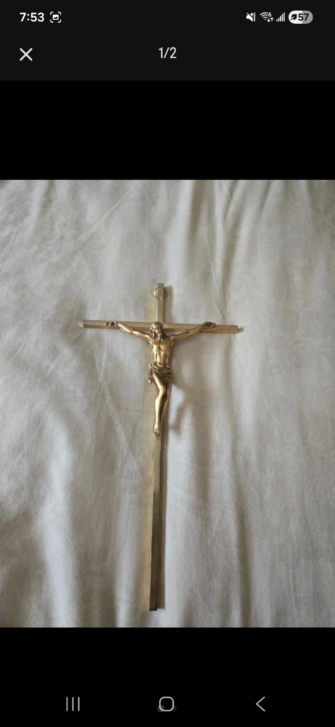 This is a wall-mounted crucifix. It features a depiction of Jesus Christ on the cross. It appears to be made of metal. Pickup only mississauga $5 firm.