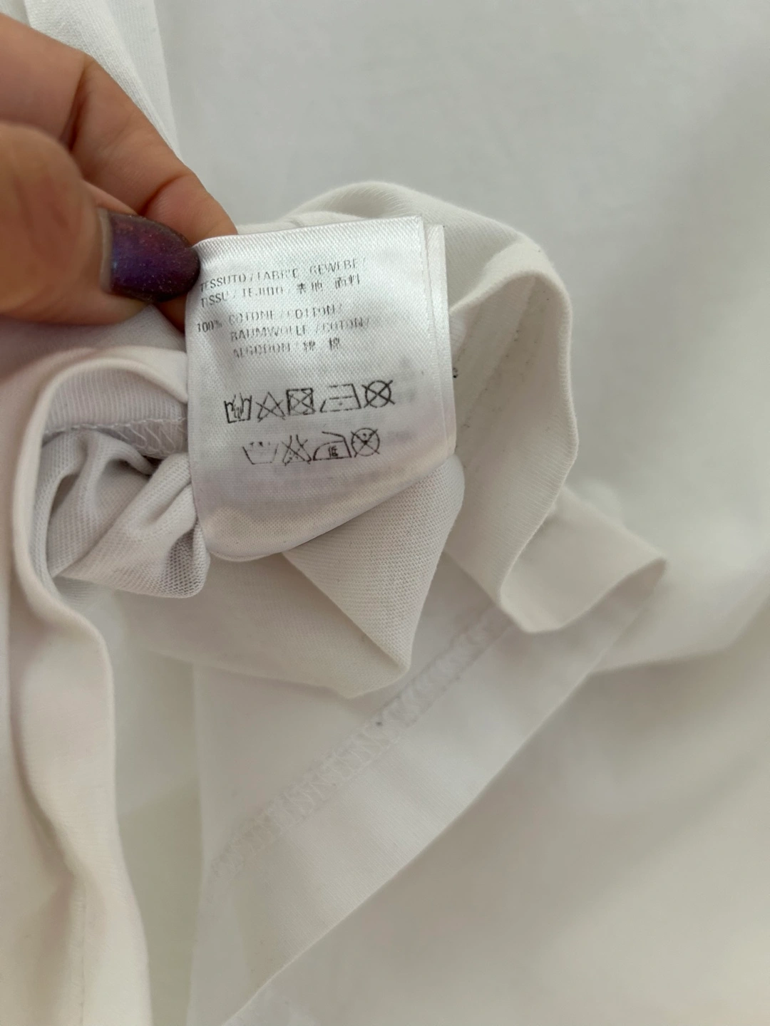 The short-sleeved t-shirt, in white. A crew neck style. There is a logo print on the front. The garment tag is visible. This tee would look great with a pair of jeans. Fits small