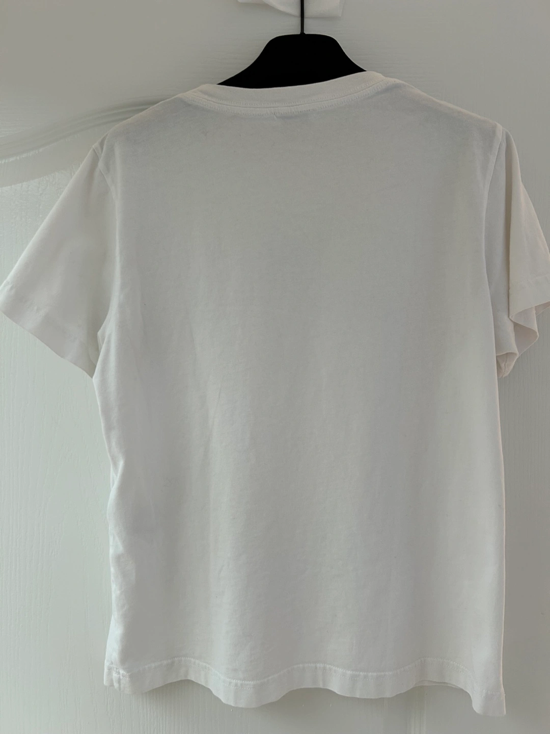 The short-sleeved t-shirt, in white. A crew neck style. There is a logo print on the front. The garment tag is visible. This tee would look great with a pair of jeans. Fits small