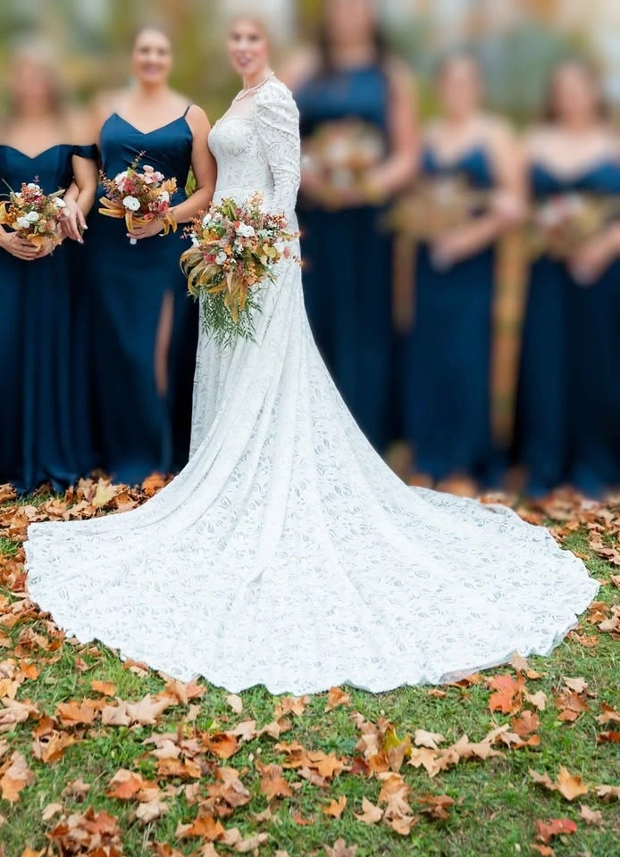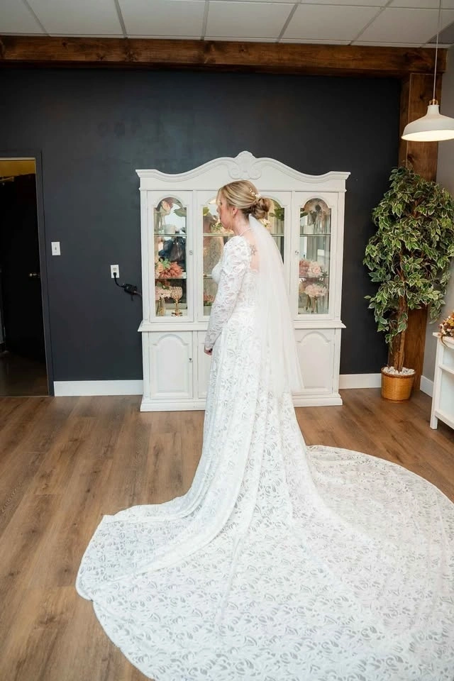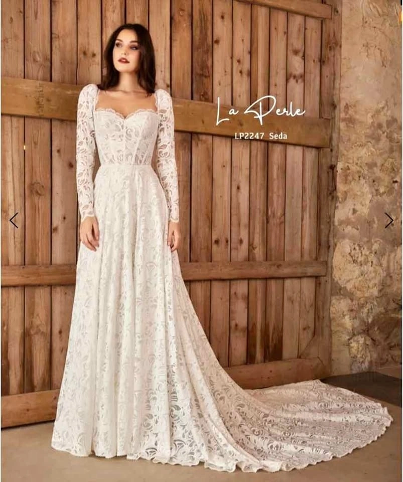 La Perle A-Line dress with sleeves. Bridal size 12. I wear a size 10. I am 5'7" and wore 3" heels. No alterations to dress, a bustle is attached that is 3 pearls above the bum that can be removed if needed. Worn but professional dry cleaned.